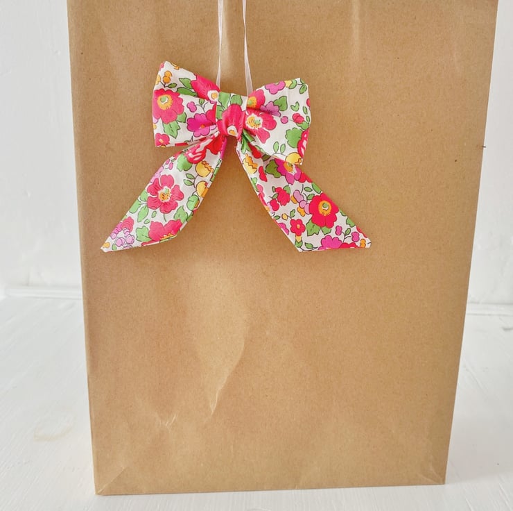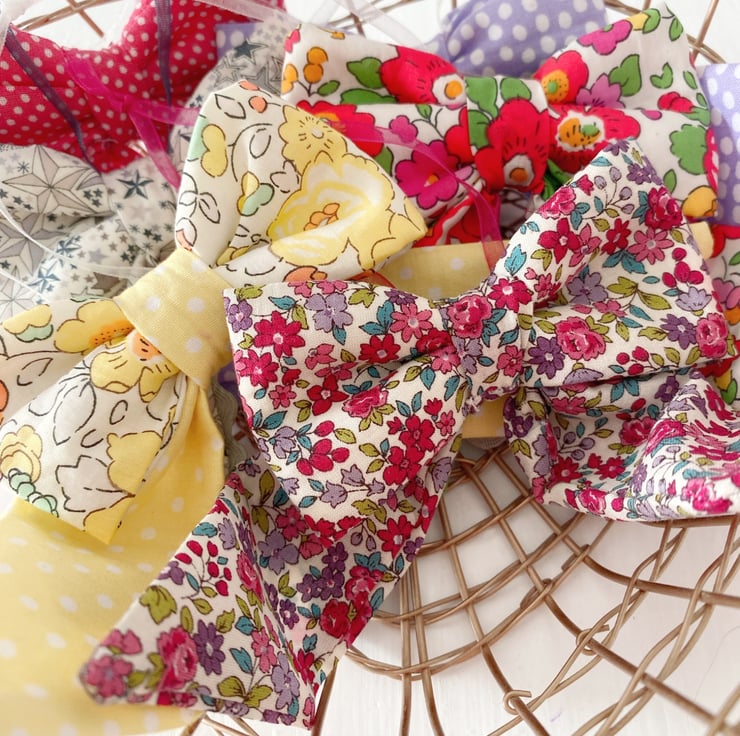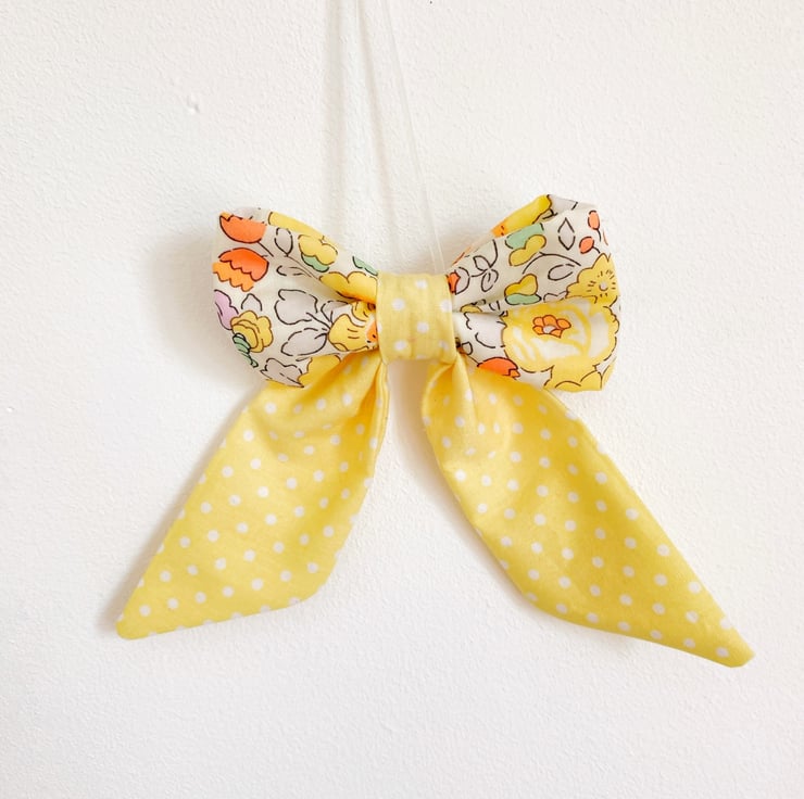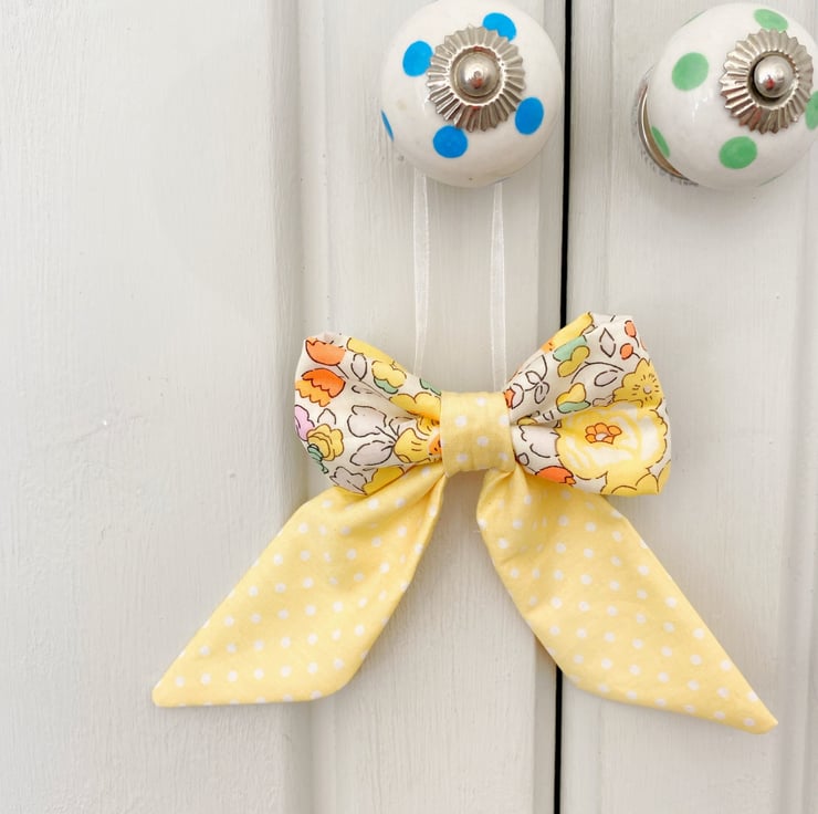 Bring a burst of sunshine into your home with this exquisite decorative bow. Handcrafted from world-renowned Liberty Tana Lawn cotton in the iconic 'Betsy' print, this version features a joyful palette of buttercup yellows, soft creams, and delicate floral accents.