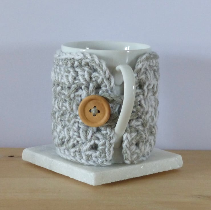 A crocheted Mug Cosy using two strands of yarn to give a marbled effect - one Light Grey and one White. This cosy measures approximately 25cm long by 9cm wide so should fit most standard mugs. Just wrap it around and fasten with the crocheted loop and natural wood button.