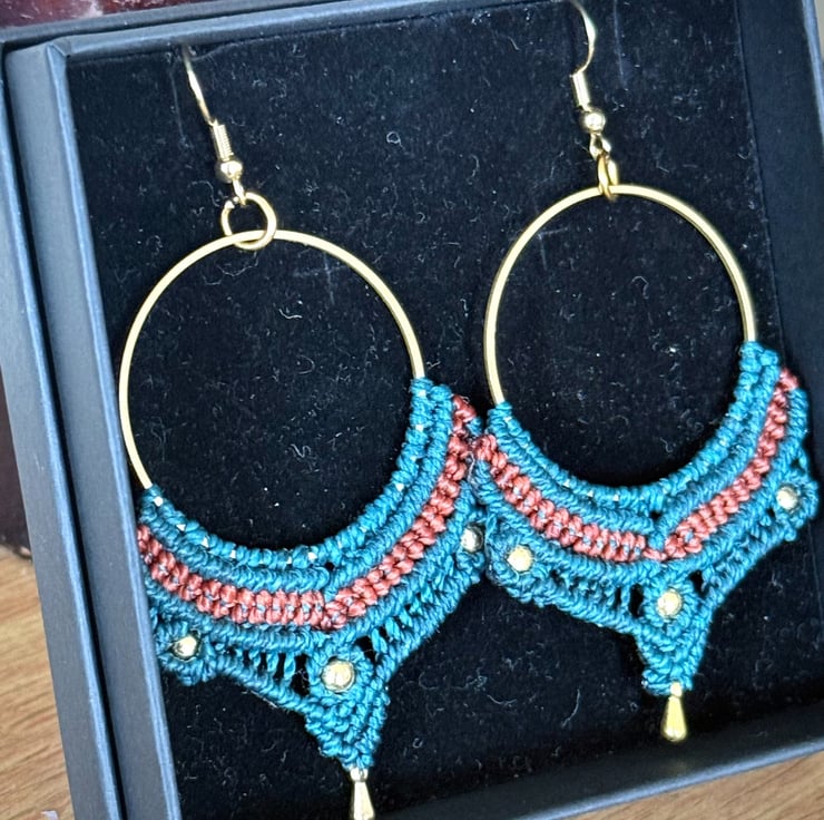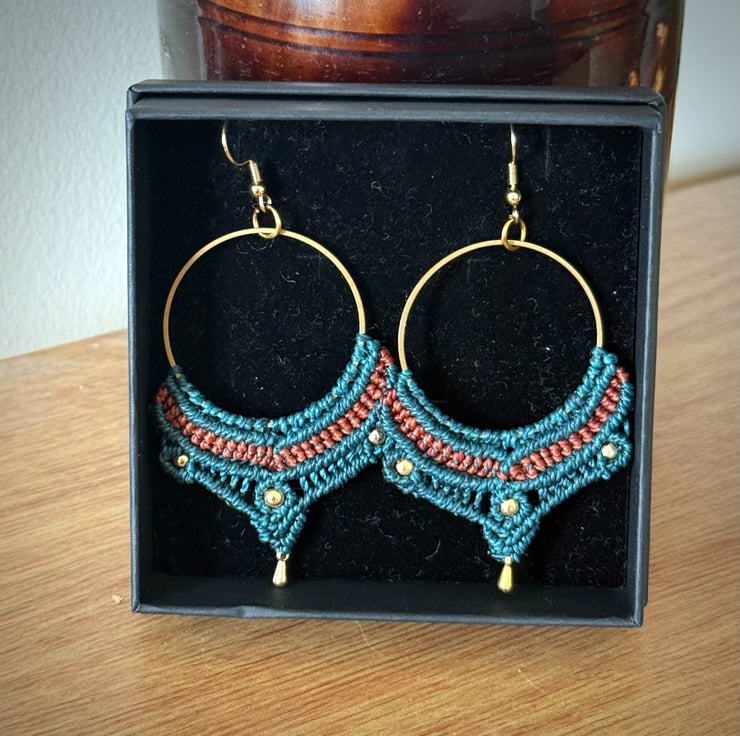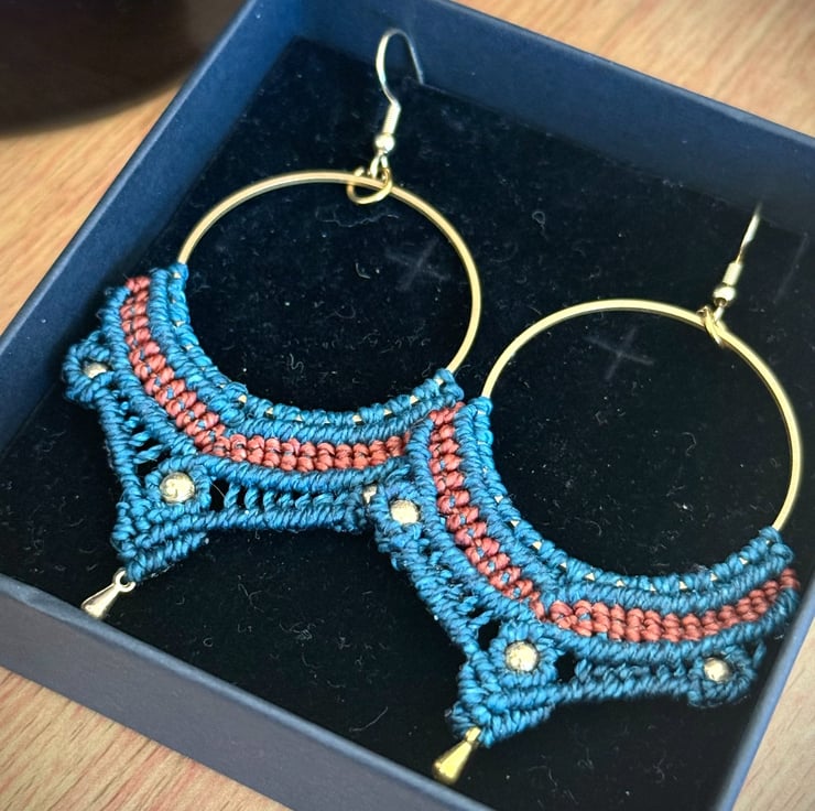 Bohemian handmade micromacrame hoop earrings in a blue and brown design with brass details.
