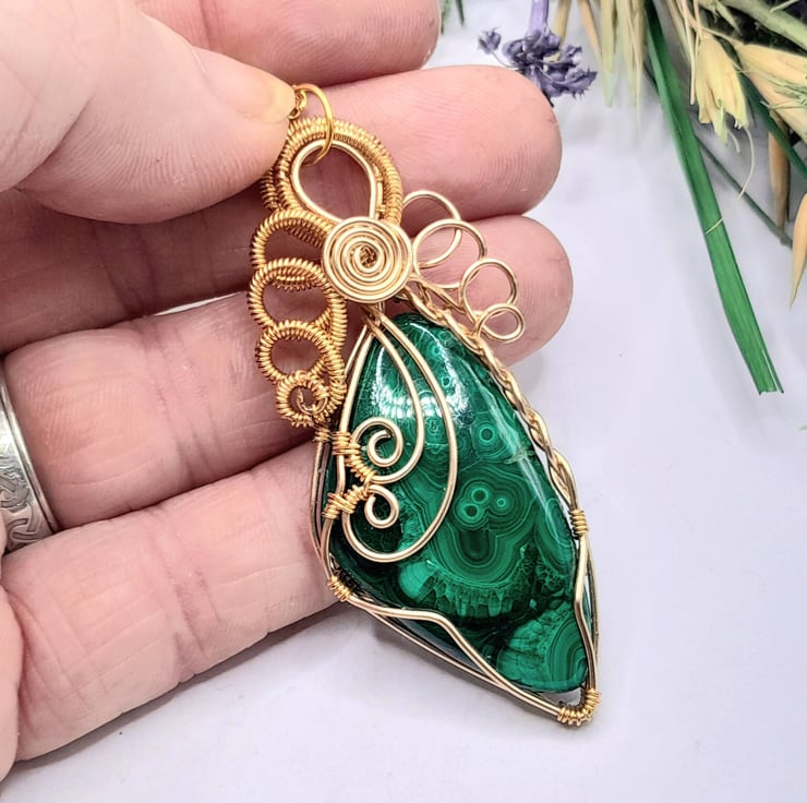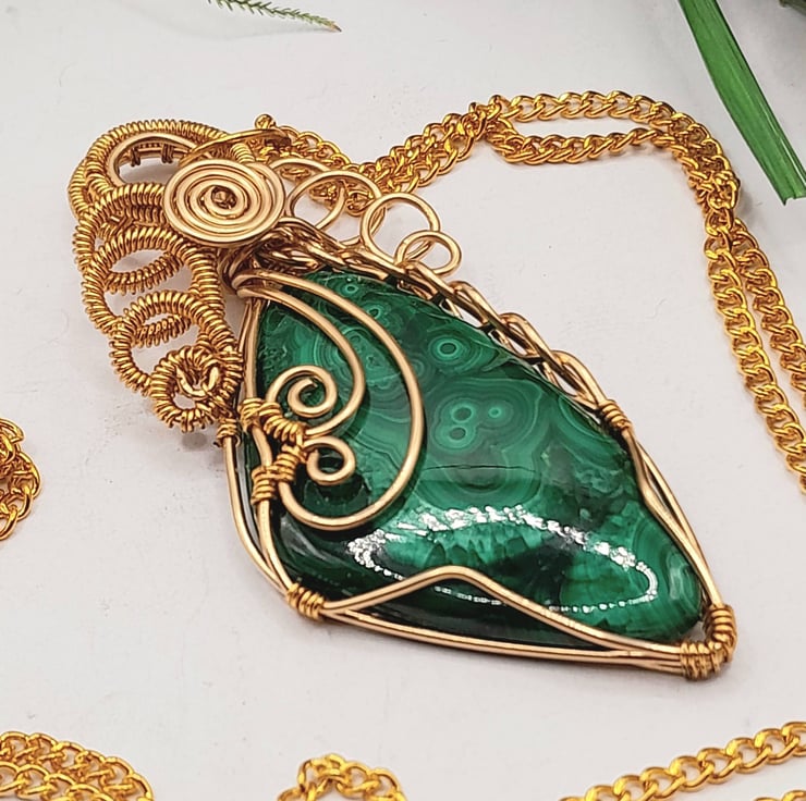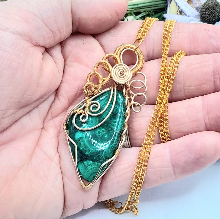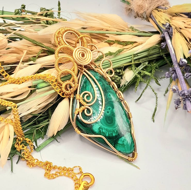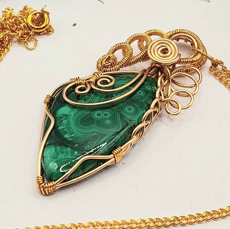 This is a beautiful wire wrapped Necklace, made using gold filled wire that has been wrapped lovingly around a freeform shaped Malachite cabochon. I have added a fancy bail, lots of swirls and some celtic braiding.