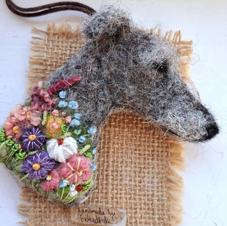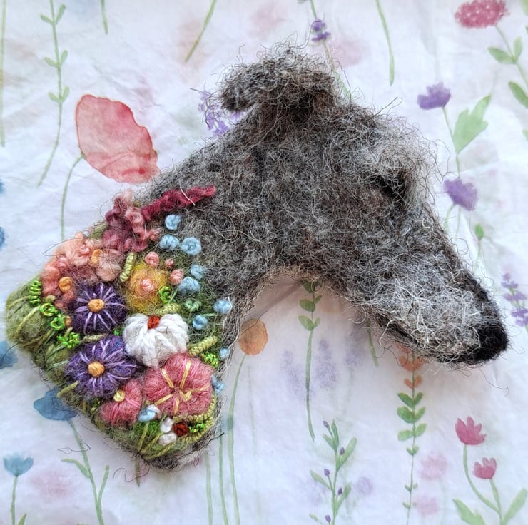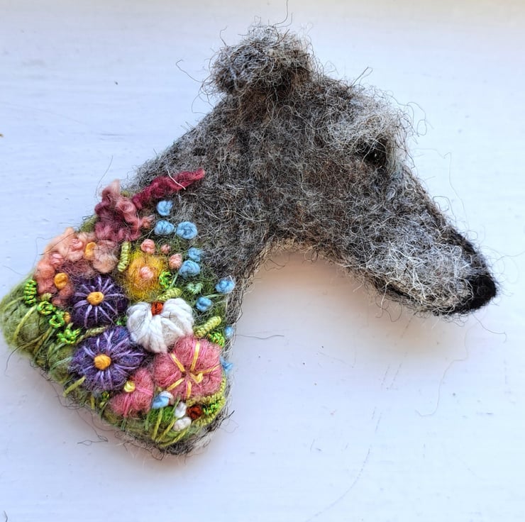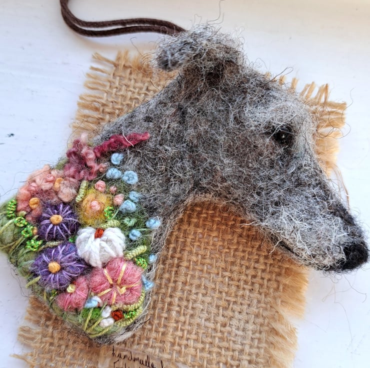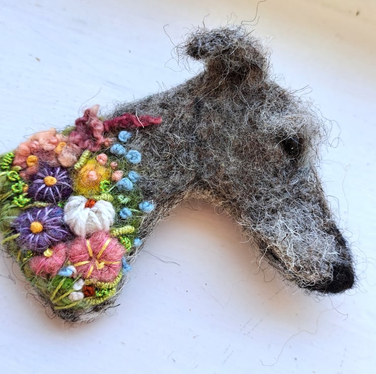 needle felted lurcher,beddy/whippetbrooch,with embroidered details,approx 3 inches,metal brooch fitting to rear