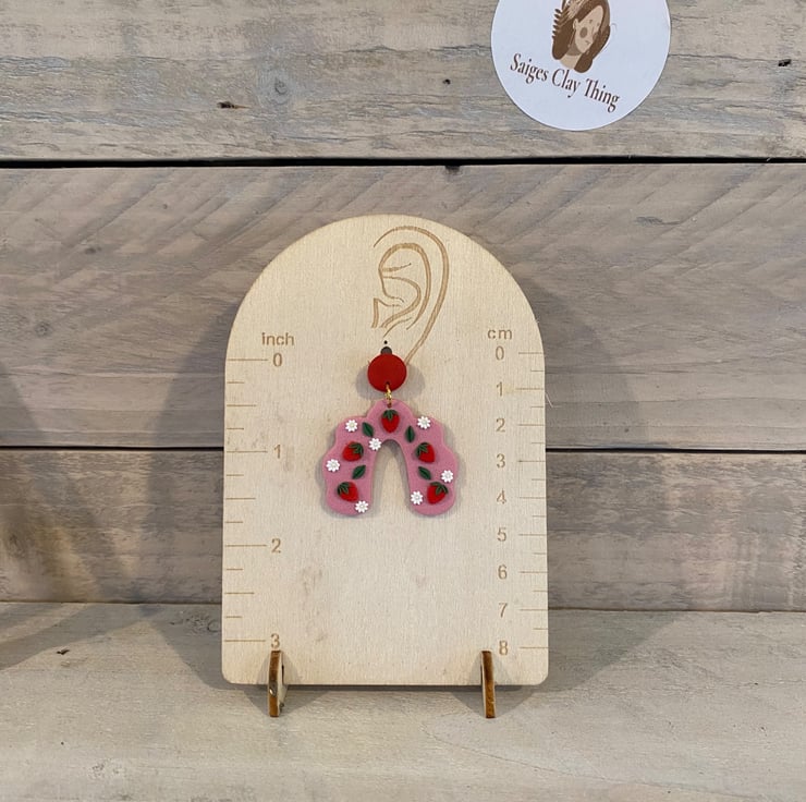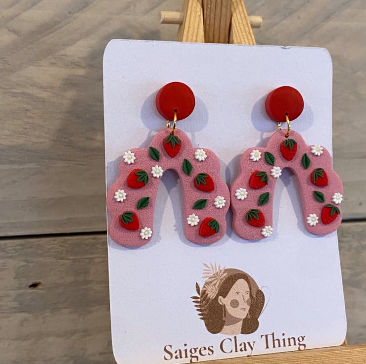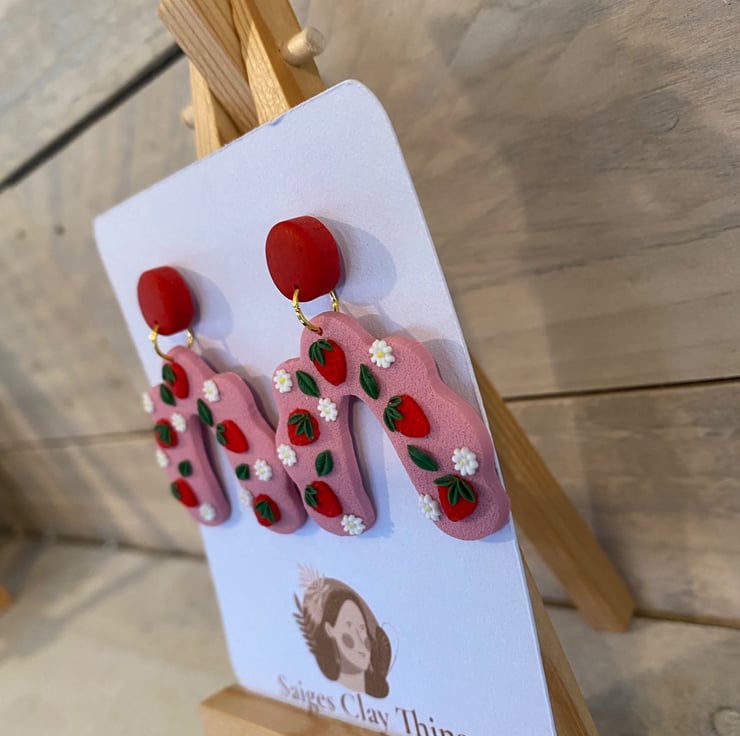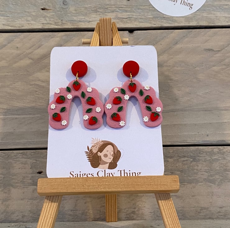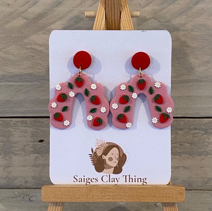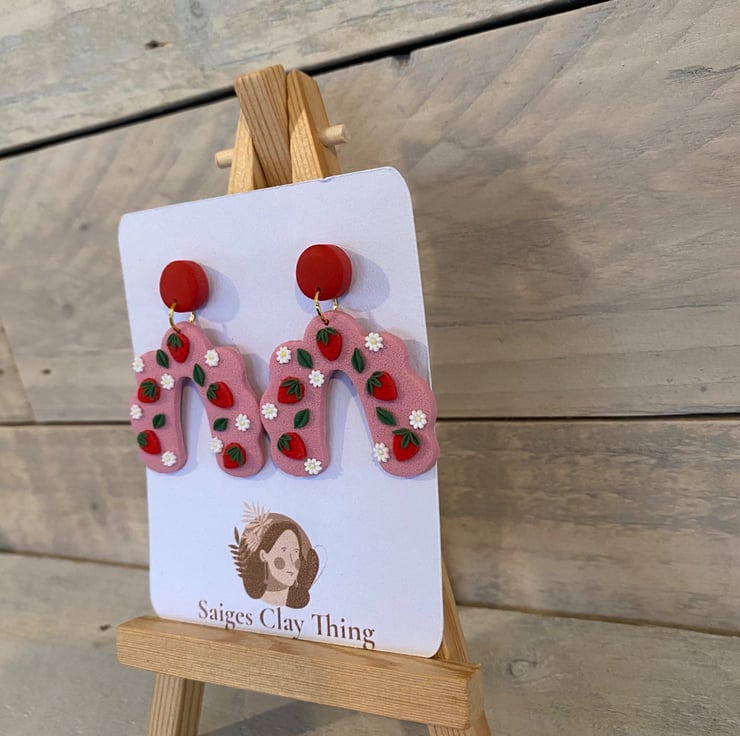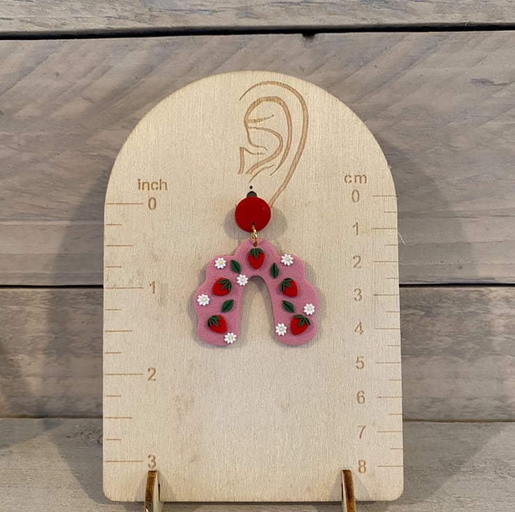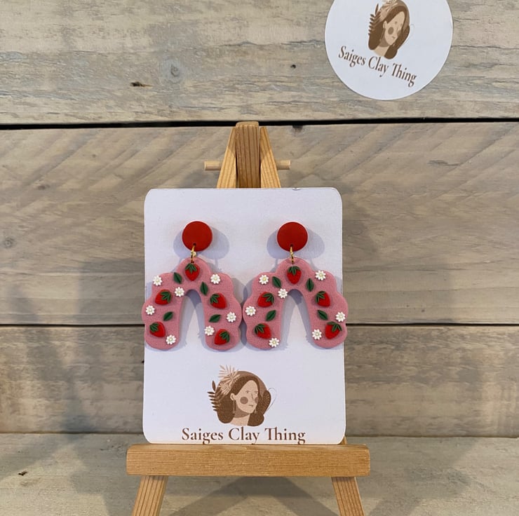 A playful pop of charm, these handmade strawberry arch earrings feature a soft pink arch with tiny strawberries, green leaves, and delicate white flowers. Crafted from lightweight polymer clay, they're perfect for spring days, picnics, and anyone who loves cute, whimsical jewellery-each pair is one of a kind.