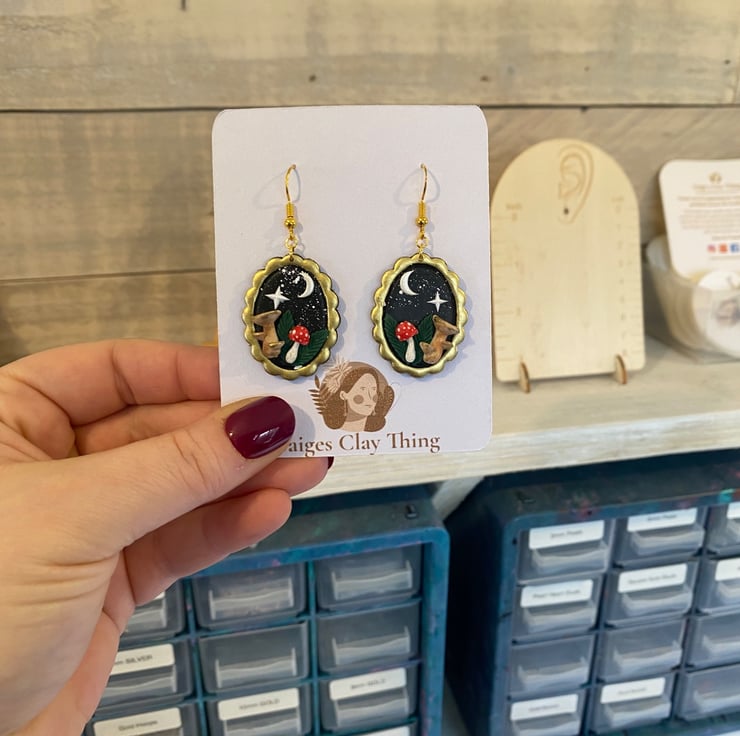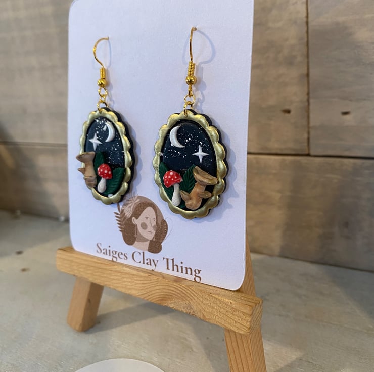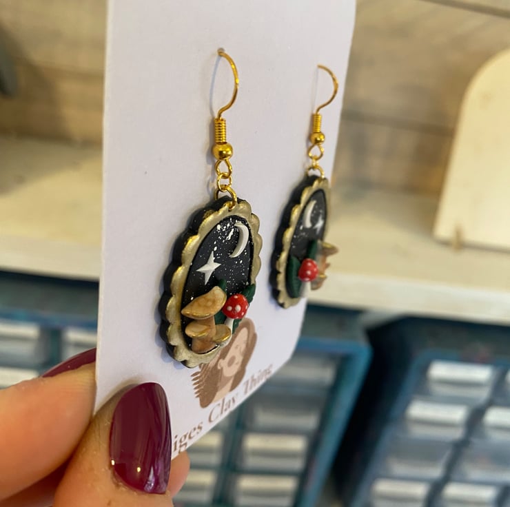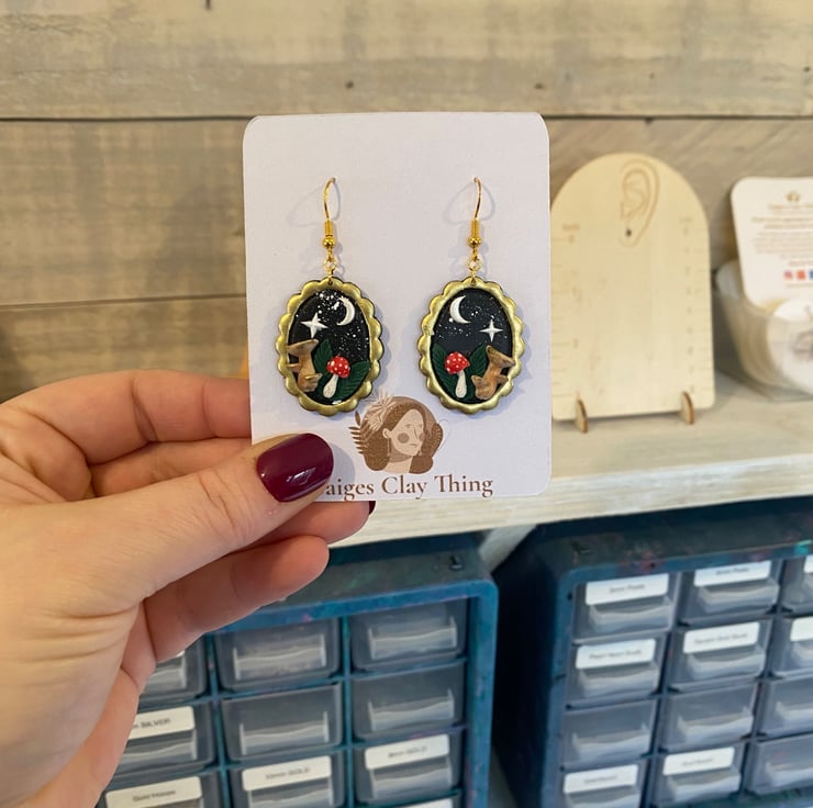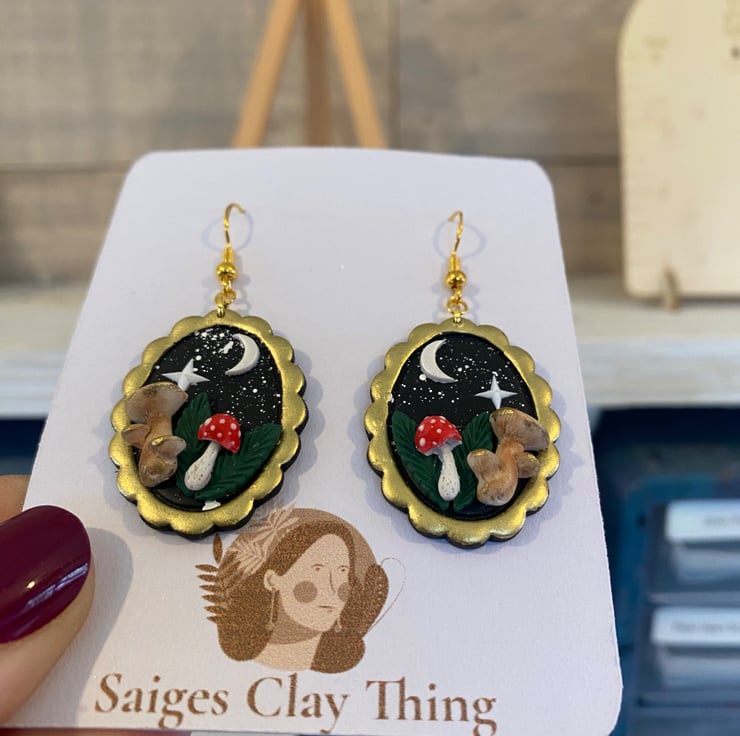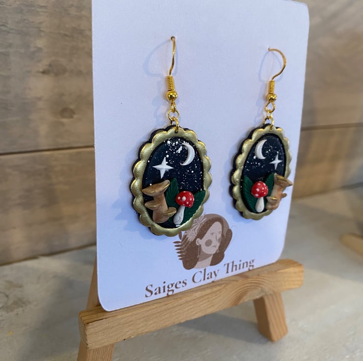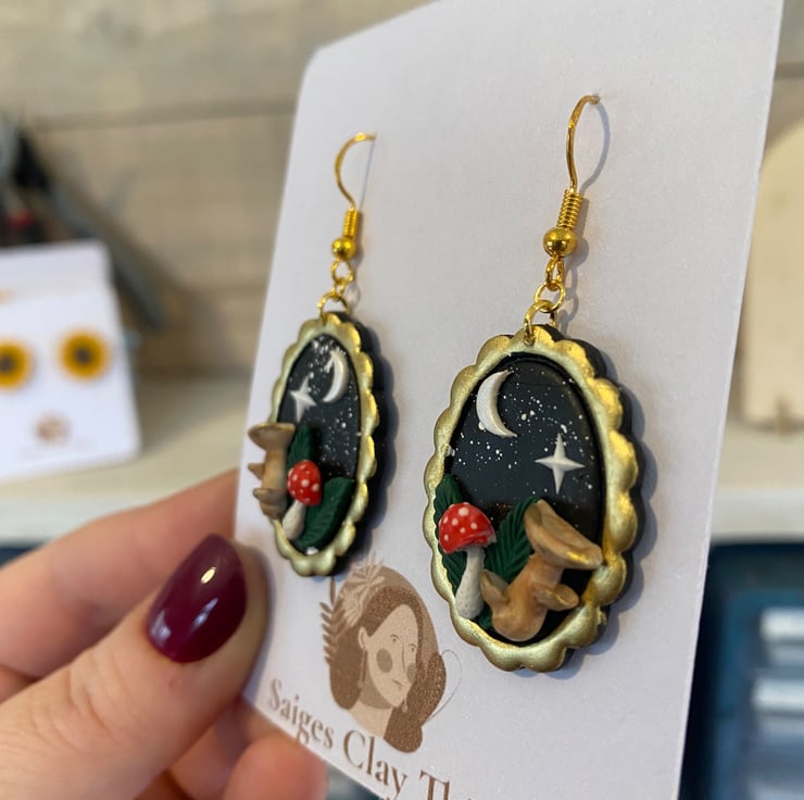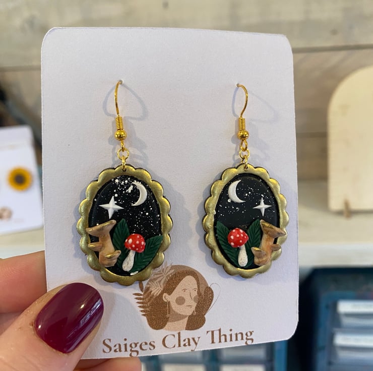 These enchanting night mushroom earrings are inspired by moonlit forests and whimsical cottage core magic. Each pair is carefully handcrafted using polymer clay and set in an antique gold-toned oval frame, featuring tiny mushrooms beneath a crescent moon and shining star against a deep night sky.