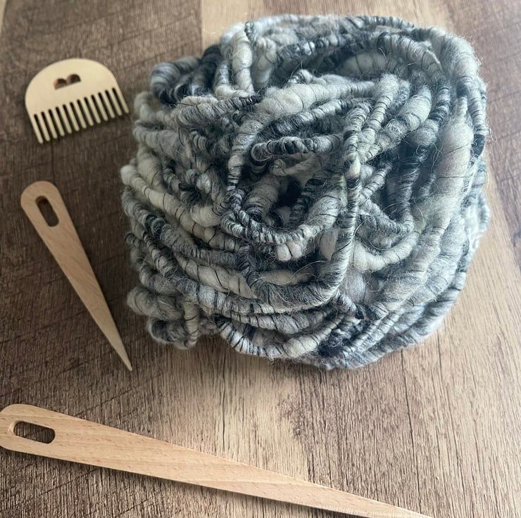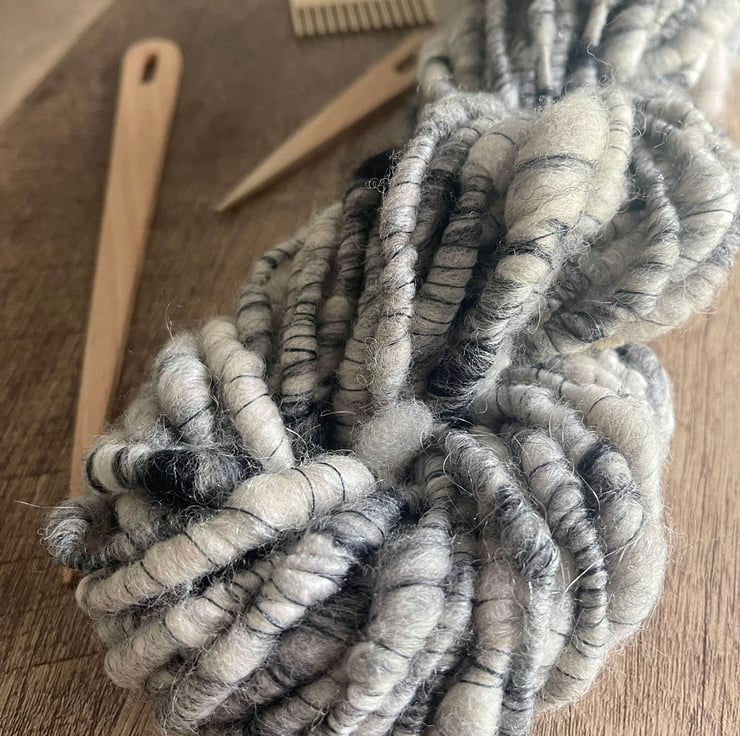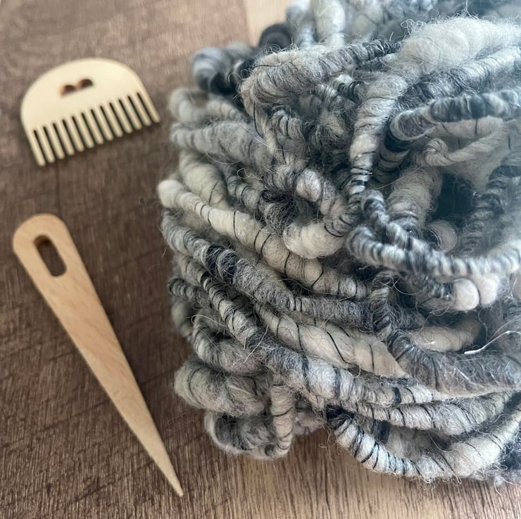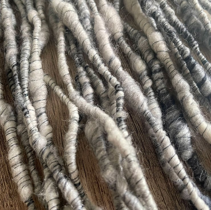 A one-of-a-kind corespun art yarn, featuring a black and white Merino wool and Corriedale wool with silver Angelina fibre and a dark grey viscose auto-wrap. Perfect textured yarn for fibre art, weaving, wall hangings, and creative textile projects.
