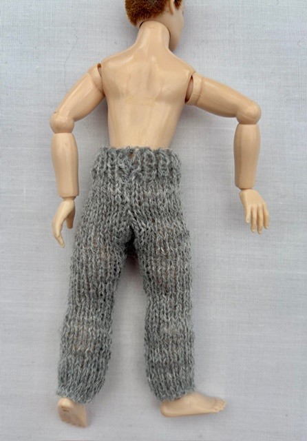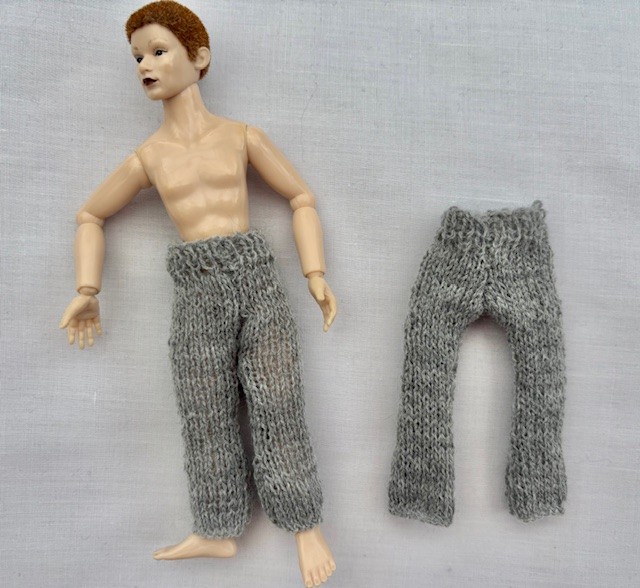 These tiny trousers have been knitted by me with a fine yarn using my own design. They look skinny but being knitted stretch beautifully to fit a doll. For the dolls house in 12th scale. Modelled by my Heidi Ott doll which is not included in the sale..