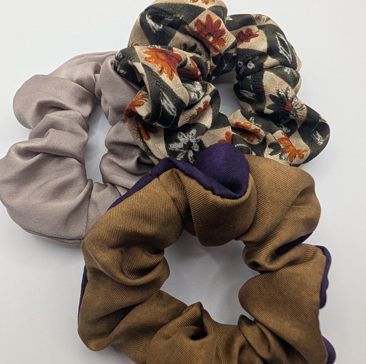 Each scrunchie is meticulously handcrafted from 100% reclaimed silk, sourced from vintage ties, scarves, dresses and blouses. Every piece carries a unique story, transformed into a timeless accessory designed to be worn and loved again.