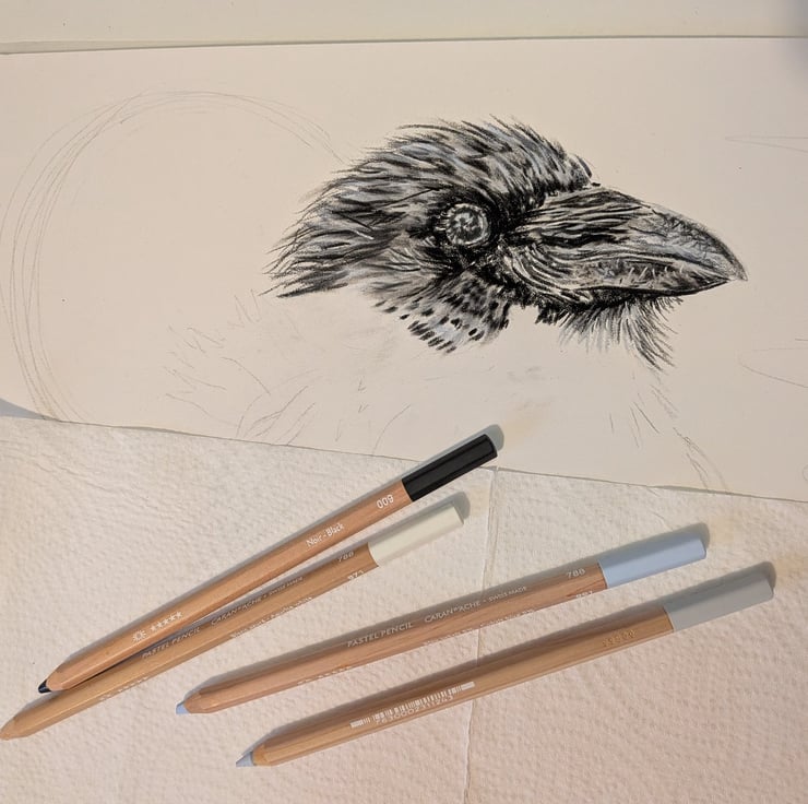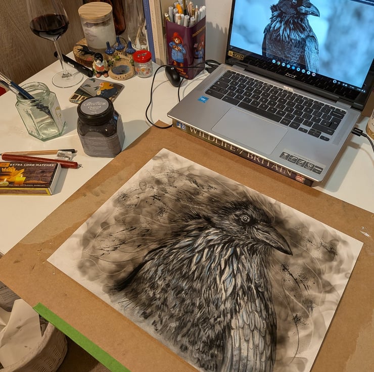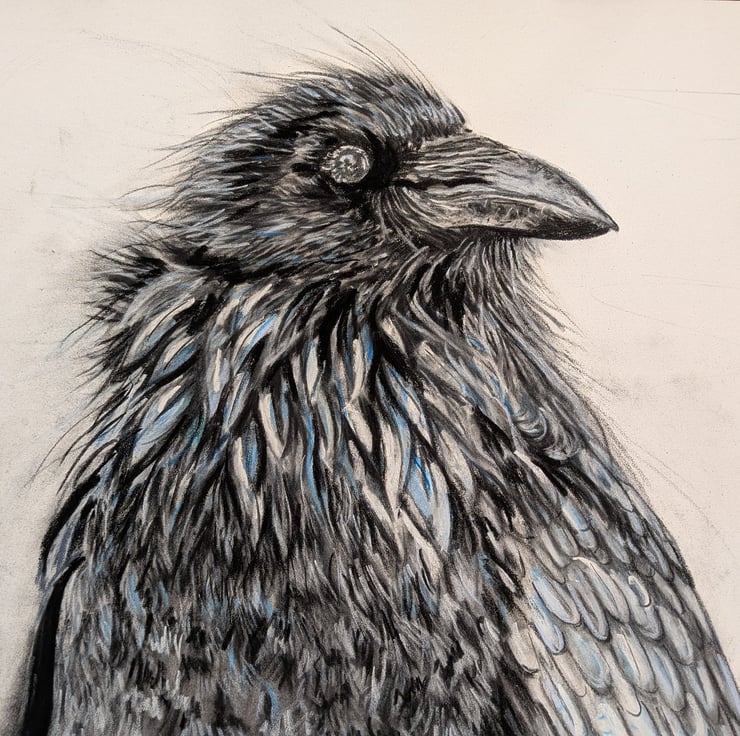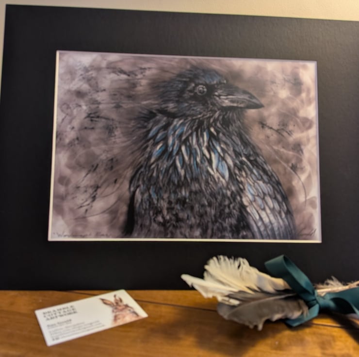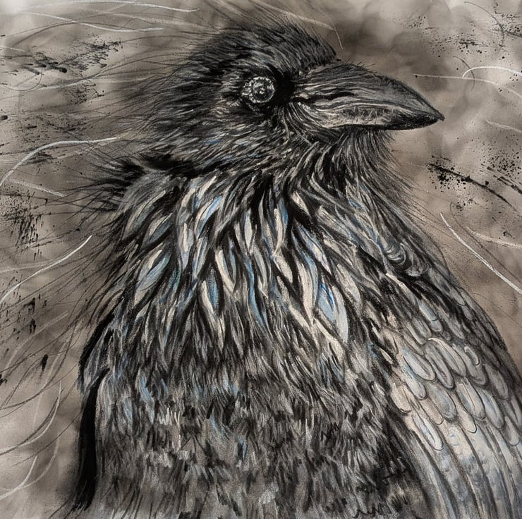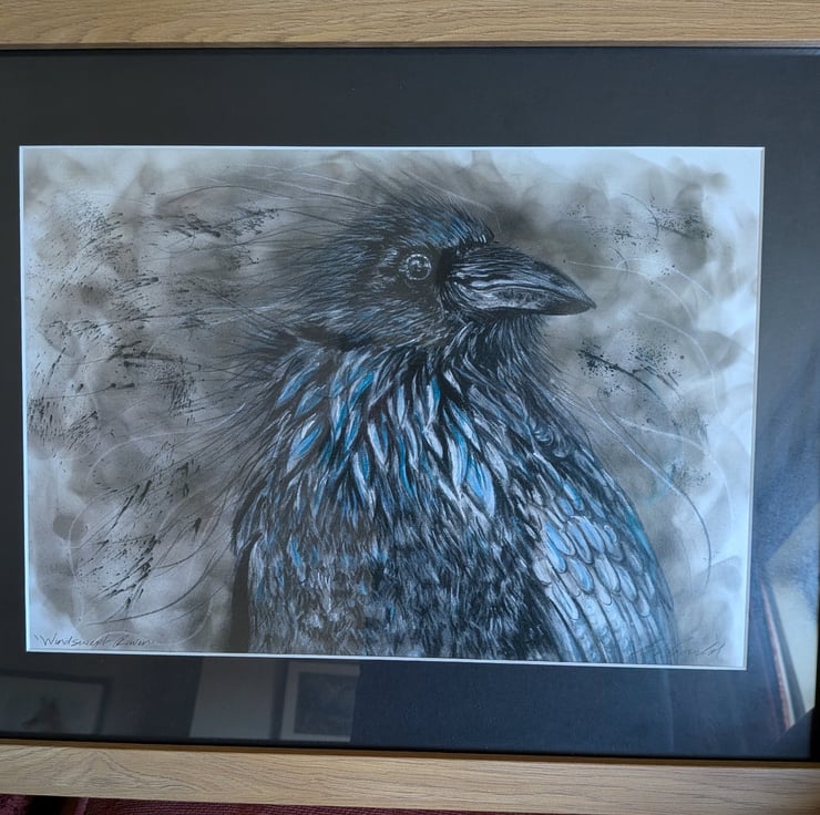 An open edition signed high quality print of an original drawing of a windswept raven. The original art work is mixed media. I used pastels and fumage (painting with candle smoke) Each print is professionally mounted . It will be wrapped in cellophane and tissue and posted in a sturdy box.