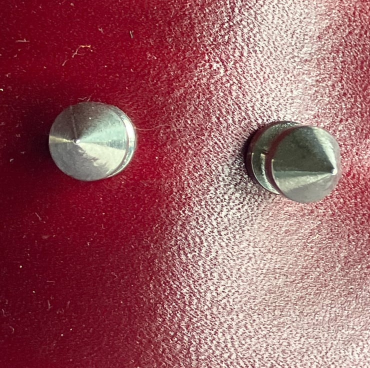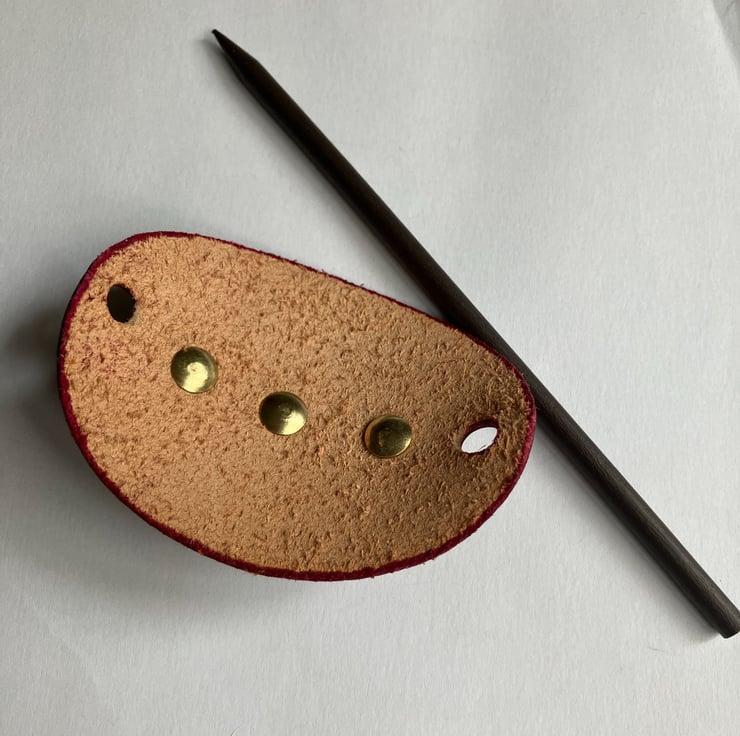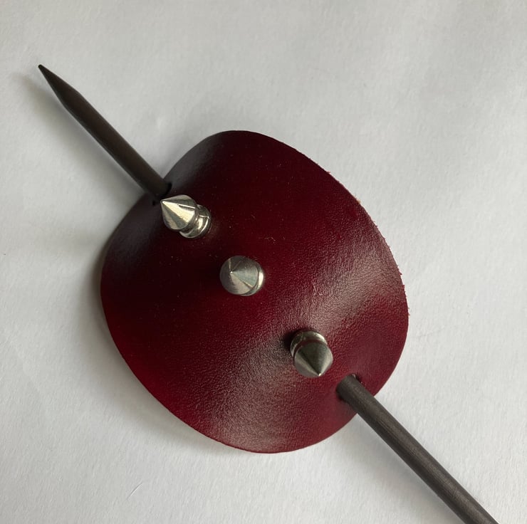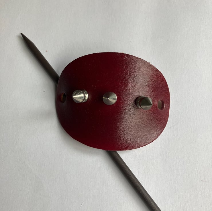 The leather is roughly 3.5 inches across. The black wood hair stick is 6" in length. I find these work best with a thin ponytail holder used underneath - it acts as a stopper so that it doesn't slide down your hair. The spikes are riveted onto the leather -- they are NOT going to fall out of the leather ! (see photo that shows the back side of the hair barrette)