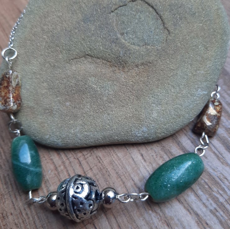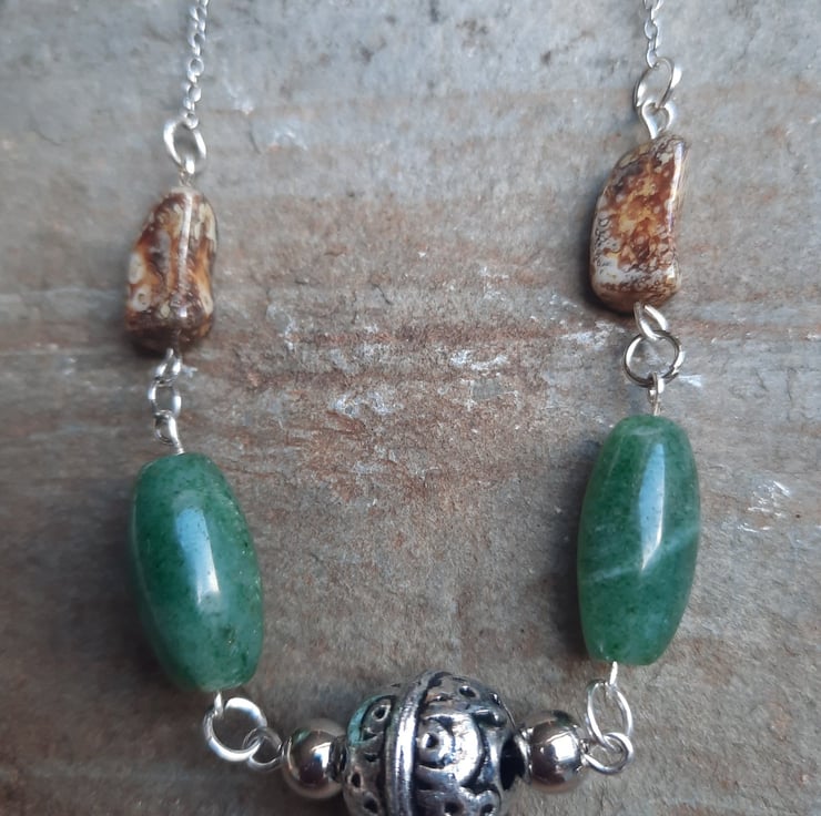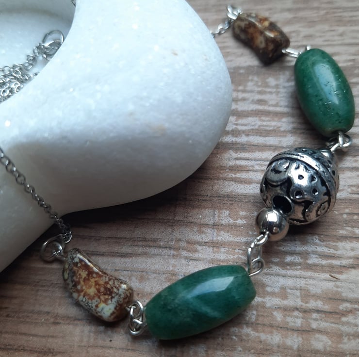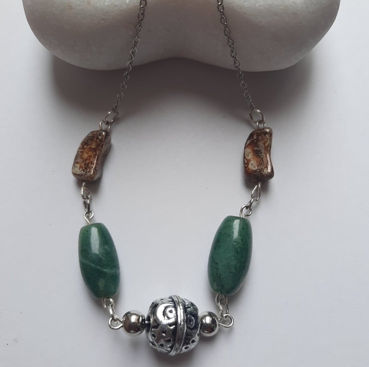 This is an Artisan style with a natural,earthy aesthetic. The juxtaposition of the polish green stones with rustic brown speckled stones gives the necklace a grounded, organic feel.