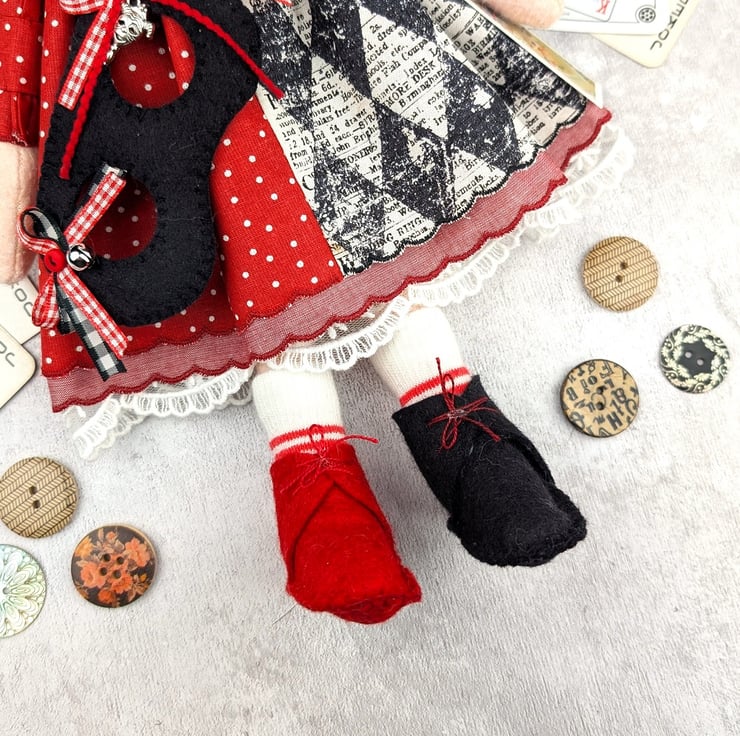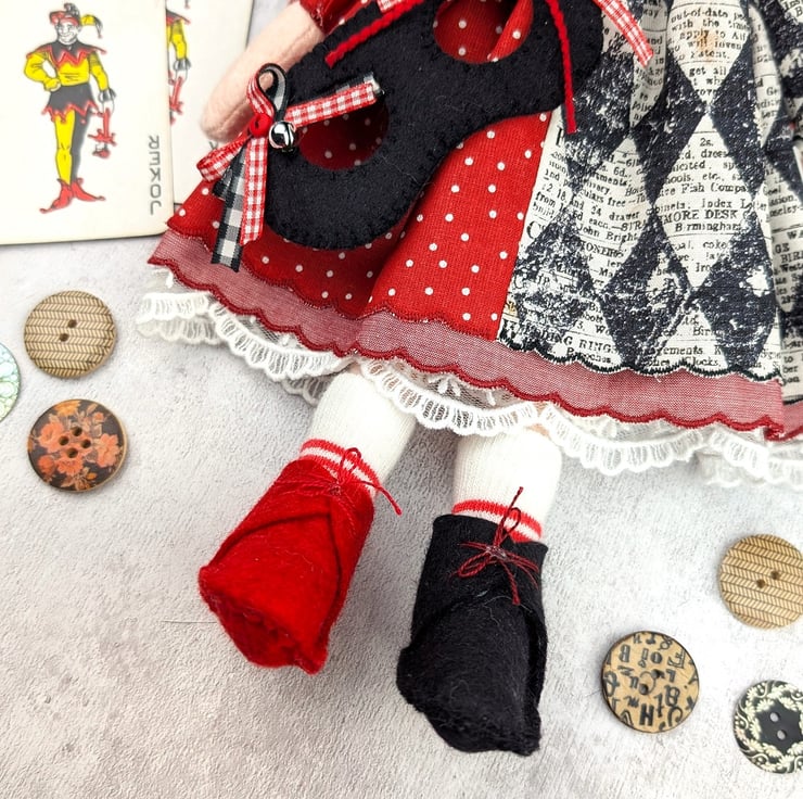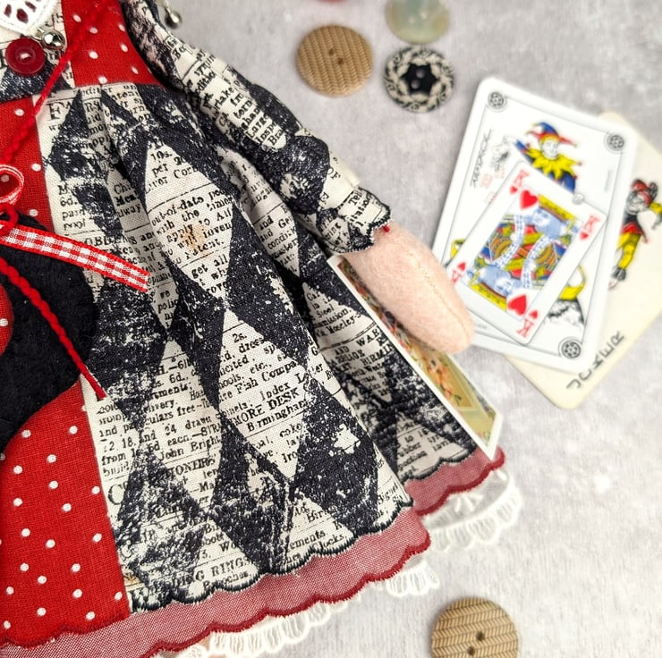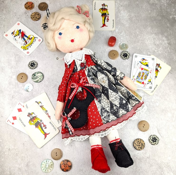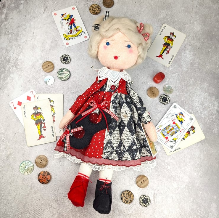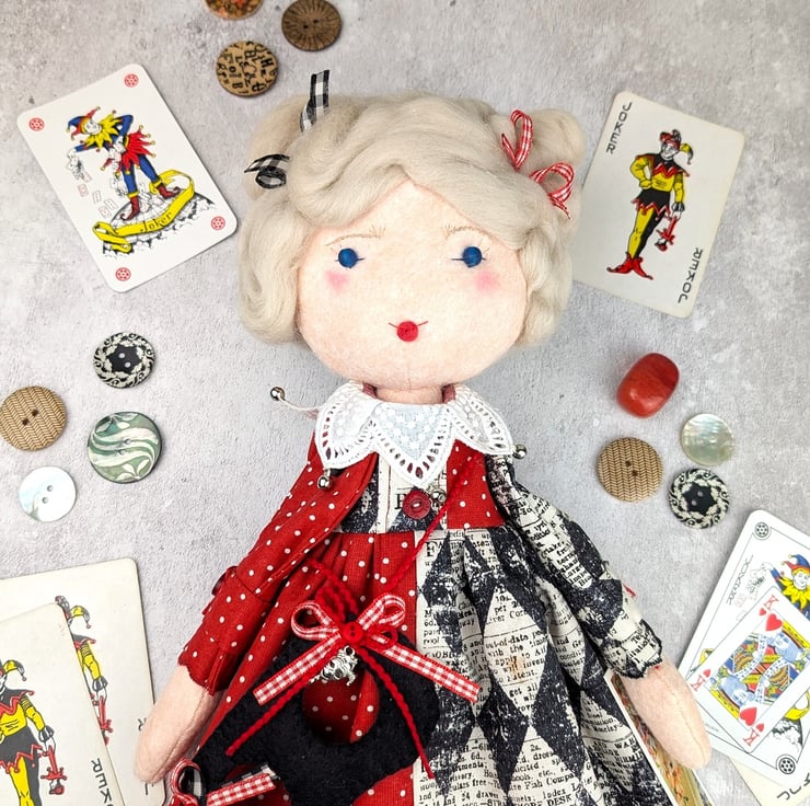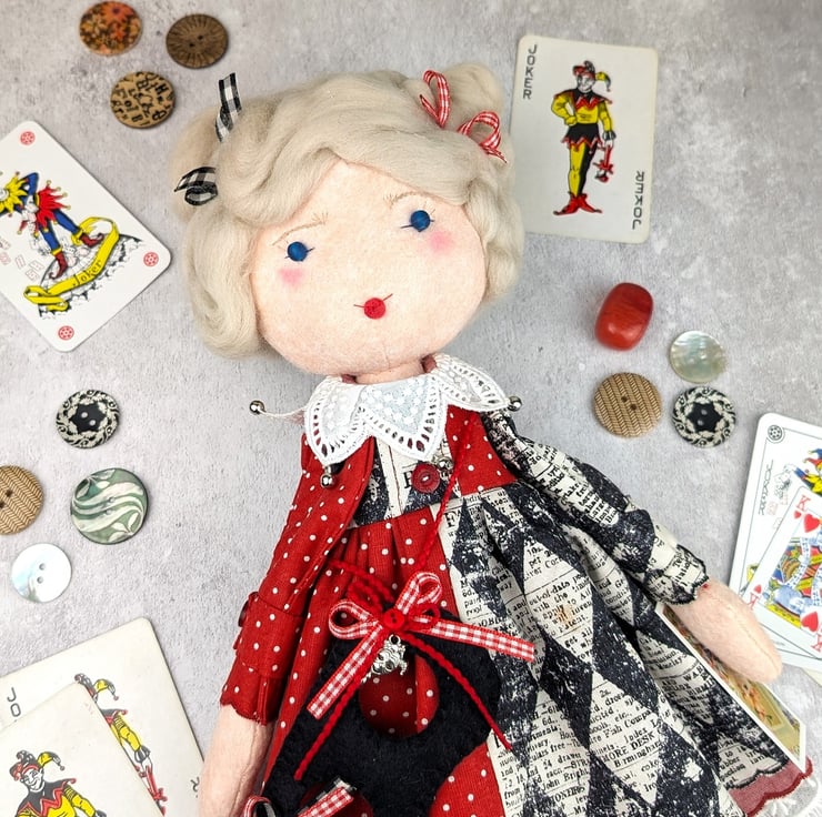 This little doll is Harleen, baby Harley Quinn. She is made from quality wool felt with frosted glass bead eyes and curly blond wool roving for hair. Her facial details are hand embroidered and her hair is hand styled. She is dressed in a two tone dress with red dot cotton and a Tim Holtz harlequin pattern. She has red chmbray and white tulle petticoats with wool felt boots in red and black. Her socks are red strips to coordinate with the ribbons in her hair.