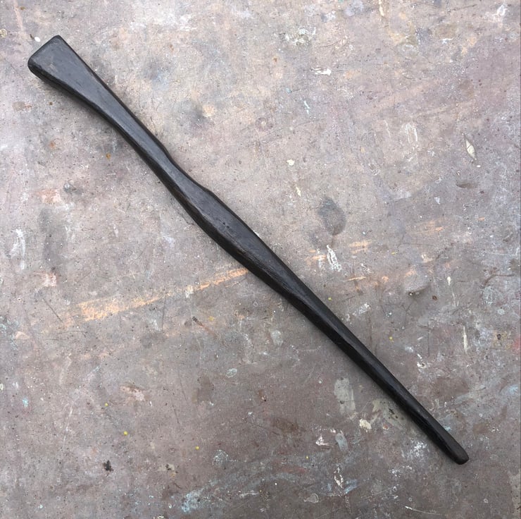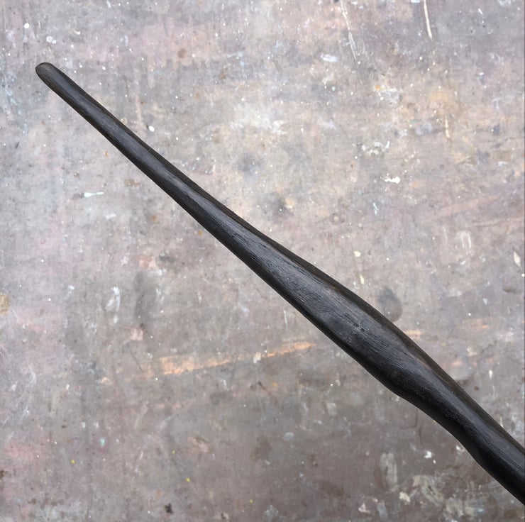 Curvy and dramatic thirteen and a quarter inch wand with a well-worn thumb groove.