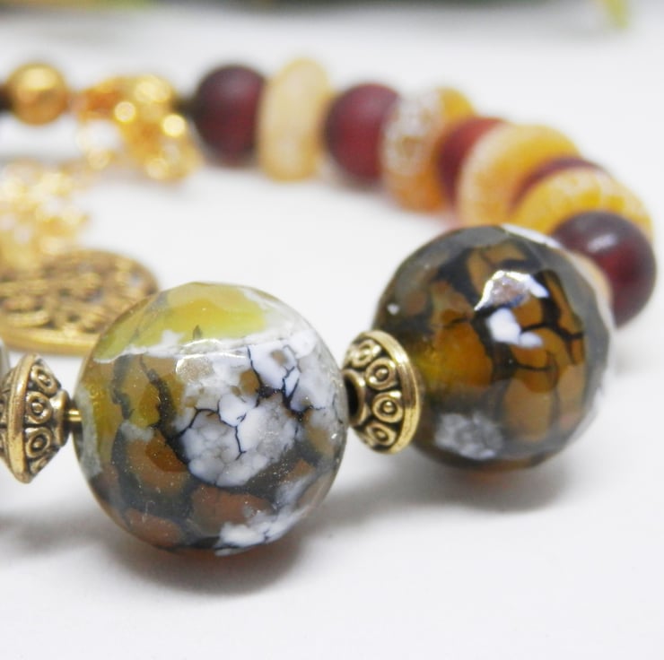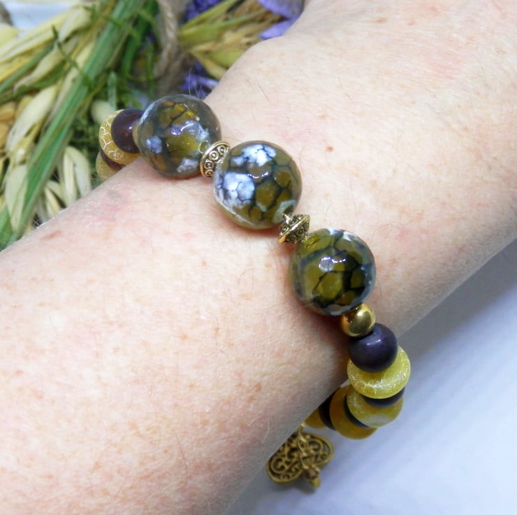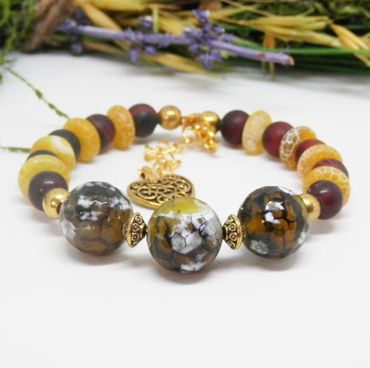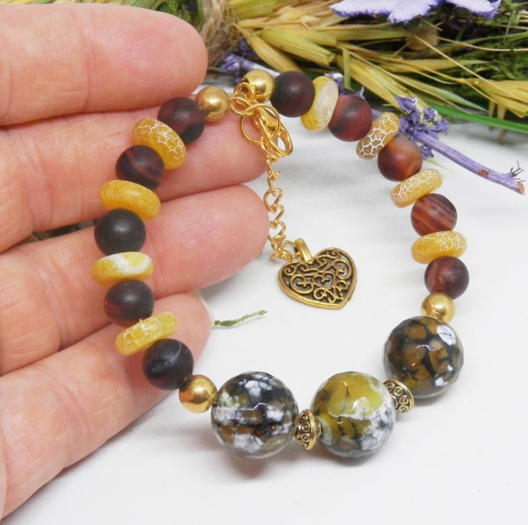 Here we have a beautiful Memory Wire Bracelet made using gold plated Memory Wire that holds it's shape. Adorned with lovely natural coloured Agate beads, larger faceted Snakeskin patterned agate beadsandgold coloured metal spacer beads.