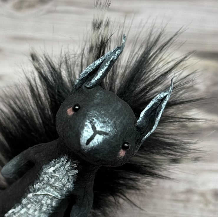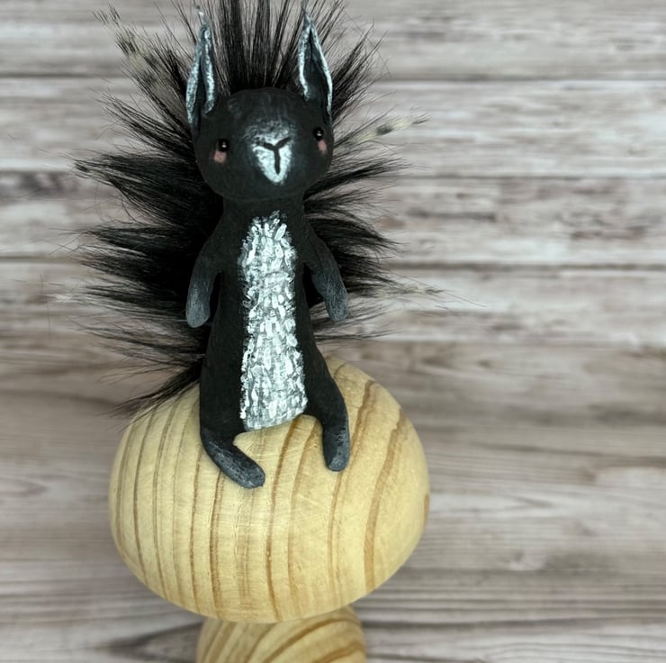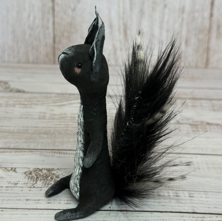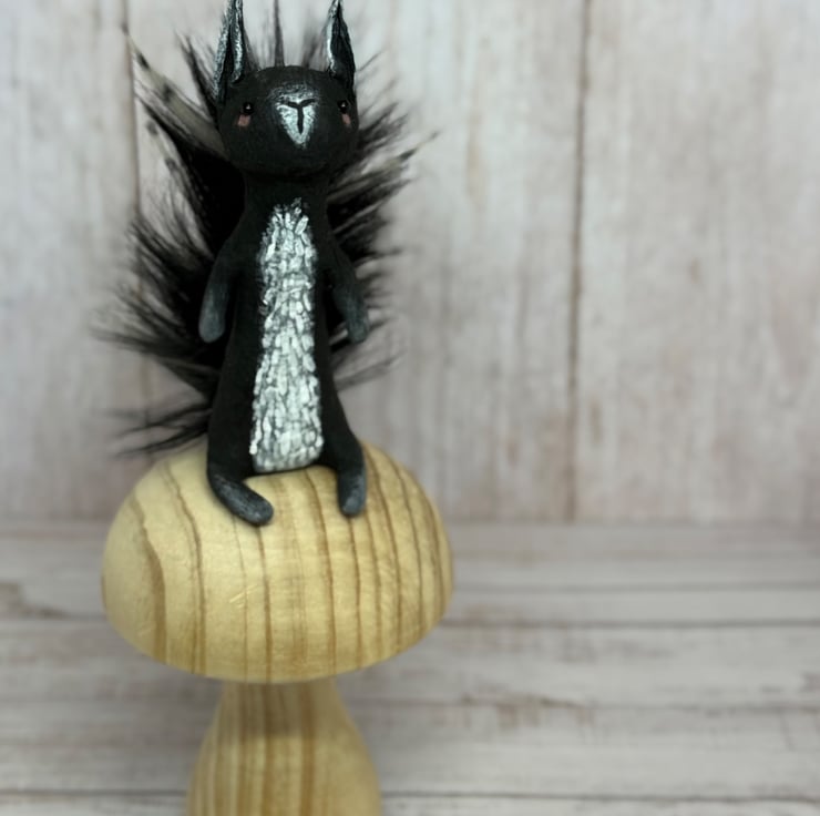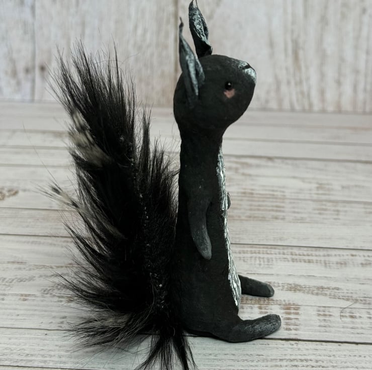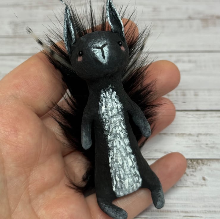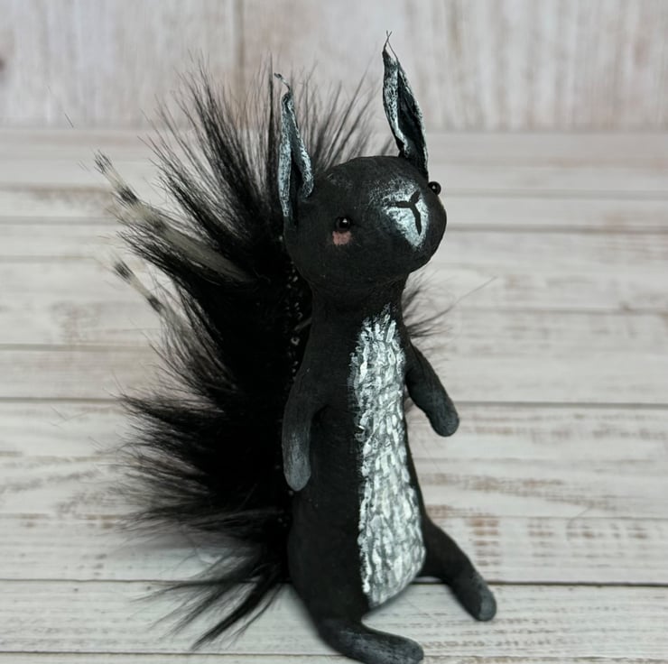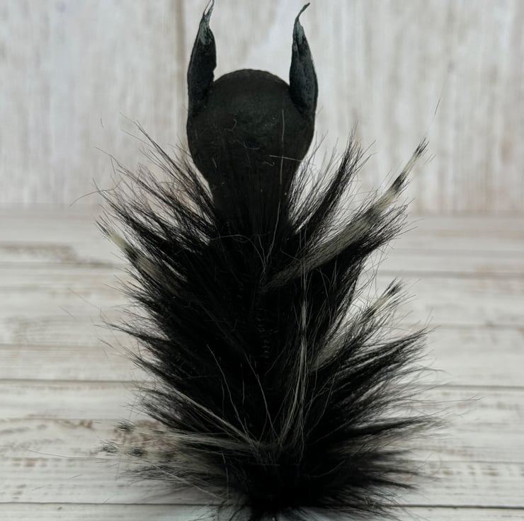 Small spun cotton squirrel with faux fur floofy tail. Squirrel has wire internal wire frame and glass bead eyes. Doll is entirely hand painted and sits unaided. Squirrel measures roughly 9.5cm tall. Arrives beautifully gift wrapped and sent in recyclable or recycled packaging. This is for decorative purposes only and not a toy.