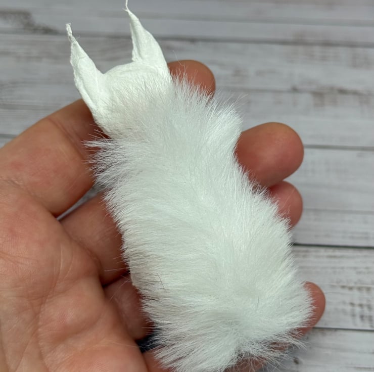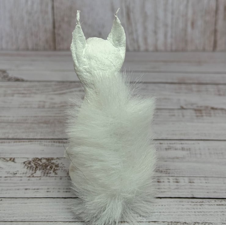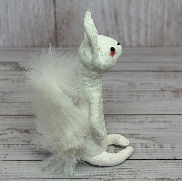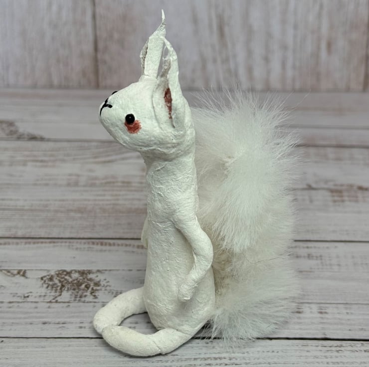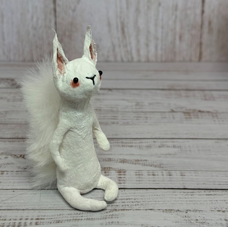 Small spun cotton squirrel with faux fur floofy tail. Squirrel has wire internal wire frame and glass bead eyes. Doll is entirely hand painted and sits unaided. Squirrel measures roughly 9.5cm tall. Arrives beautifully gift wrapped and sent in recyclable or recycled packaging. This is for decorative purposes only and not a toy.