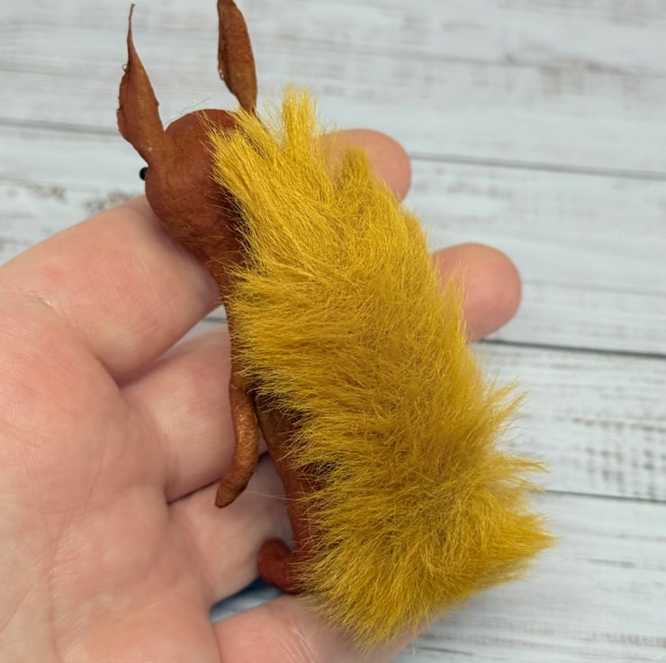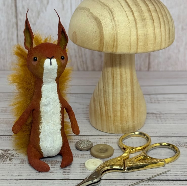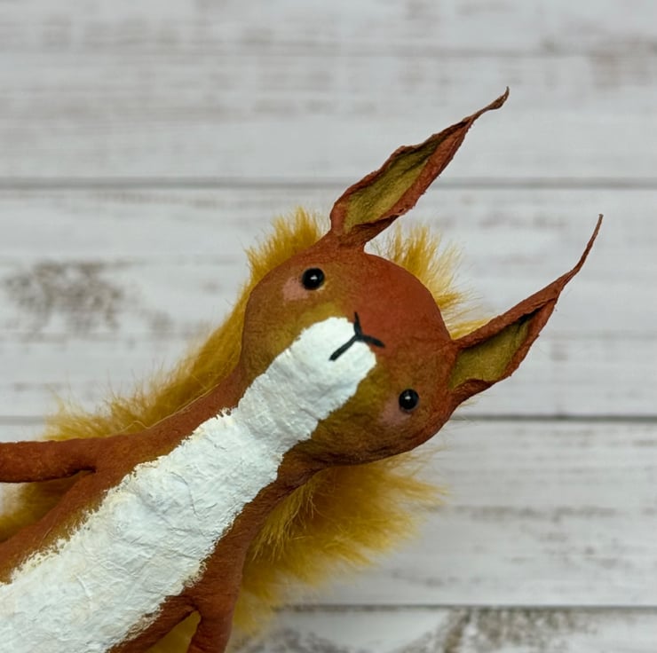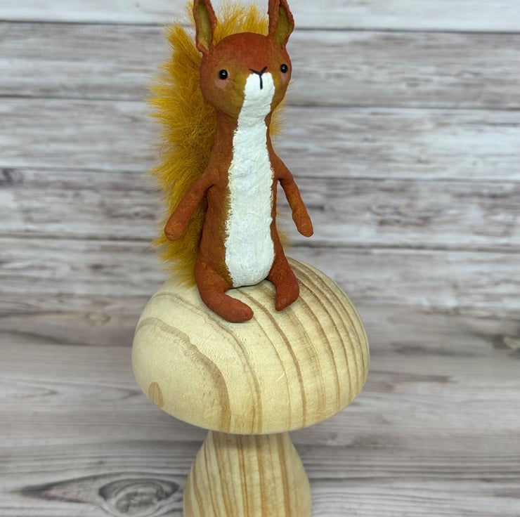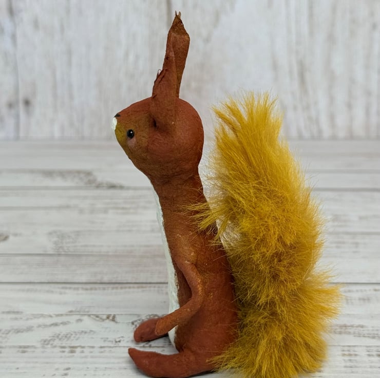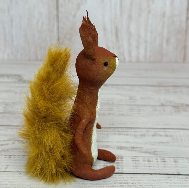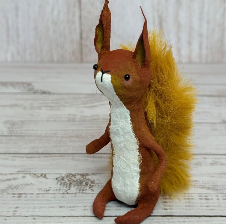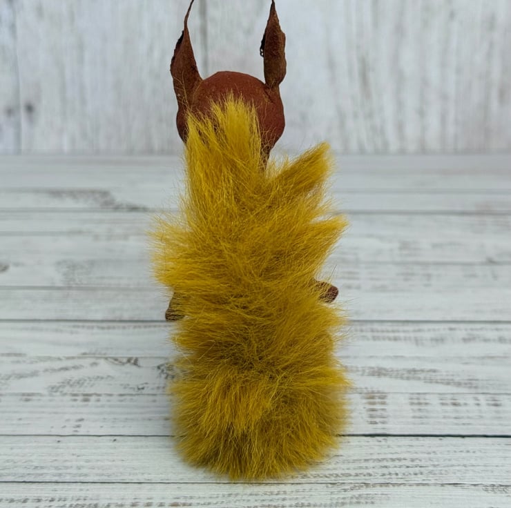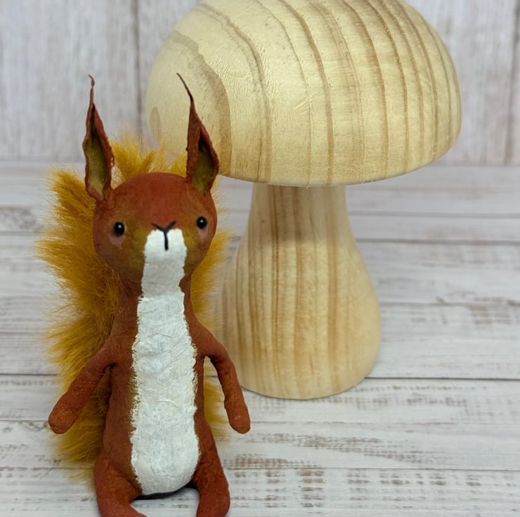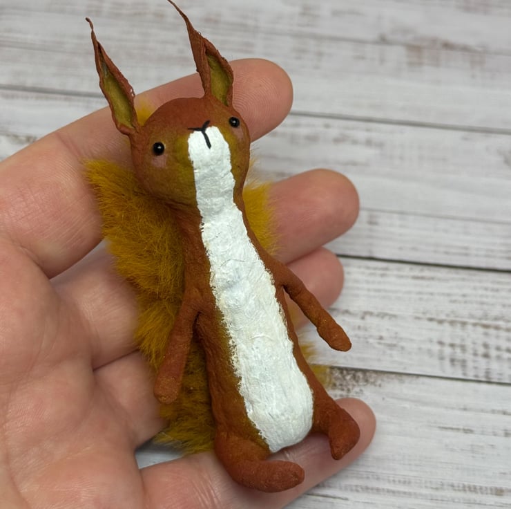 Small spun cotton squirrel with faux fur floofy tail. Squirrel has wire internal wire frame and glass bead eyes. Doll is entirely hand painted and sits unaided. Squirrel measures roughly 9.5cm tall. Arrives beautifully gift wrapped and sent in recyclable or recycled packaging. This is for decorative purposes only and not a toy.