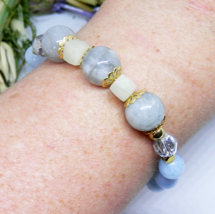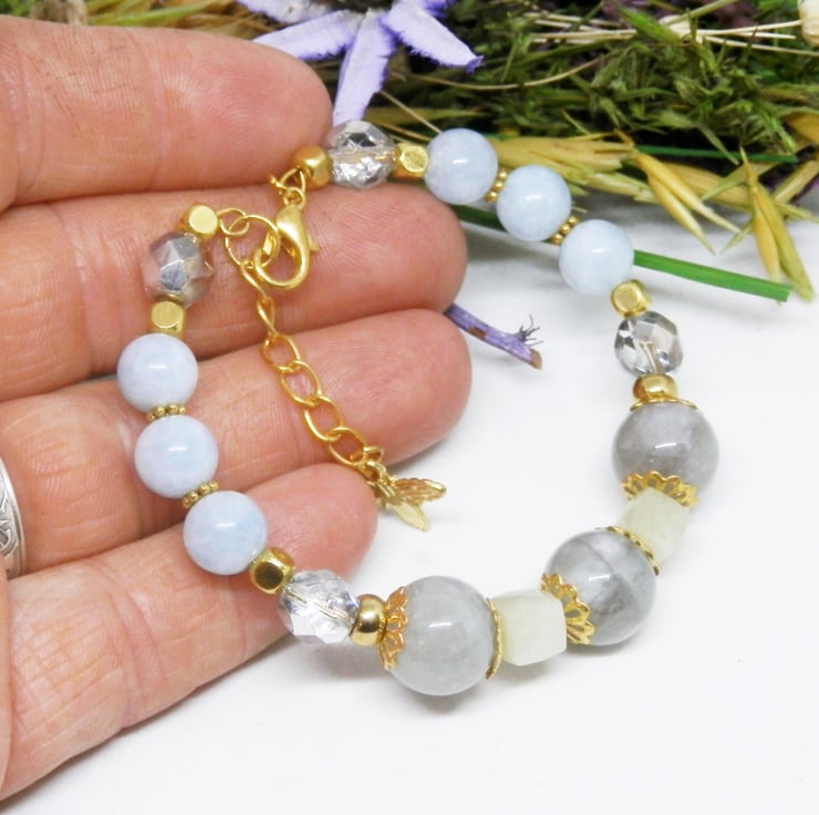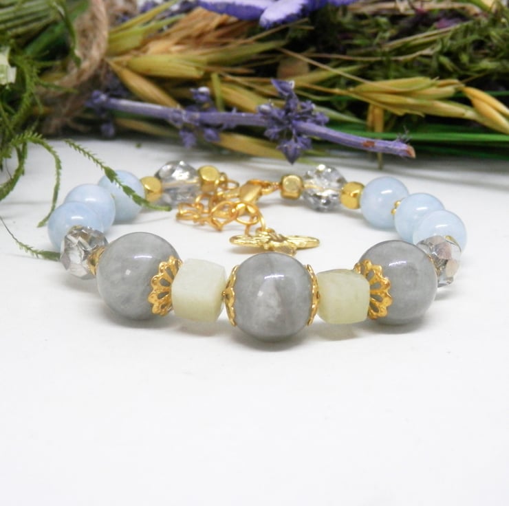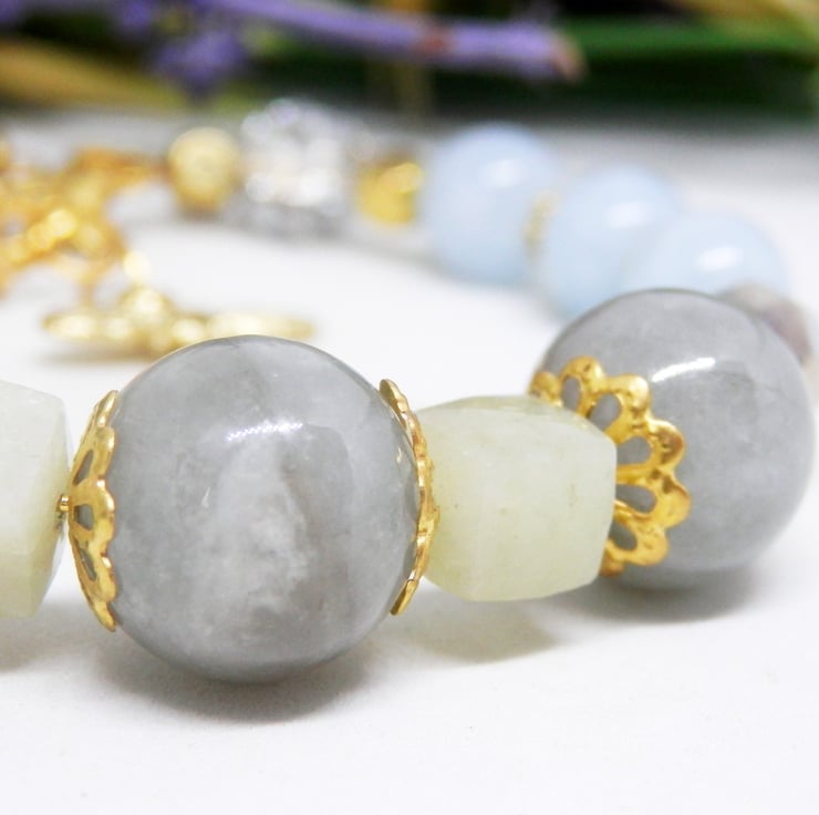 Here we have a beautiful Memory Wire Bracelet made using gold plated Memory Wire that holds it's shape. Adorned with a variety of differently shaped and coloured Aquamarine beads, spacers and faceted silver coloured beads.
