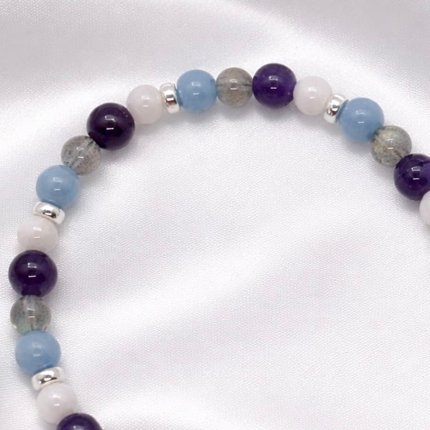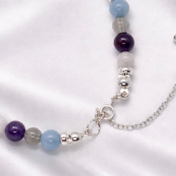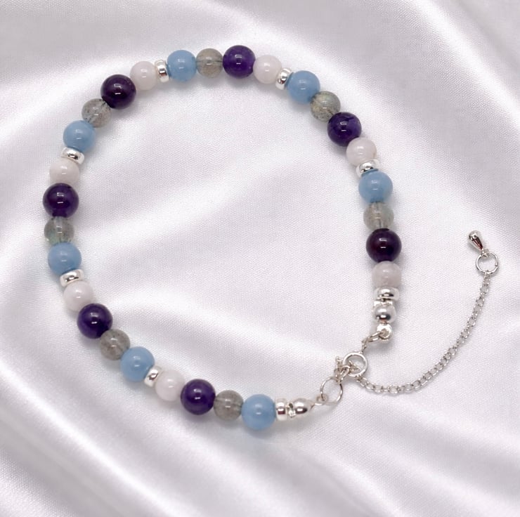 This beautiful handmade dainty gemstone bracelet shows the powerful combination of Angelite, White Moonstone,Amethyst and Labradorite,