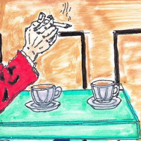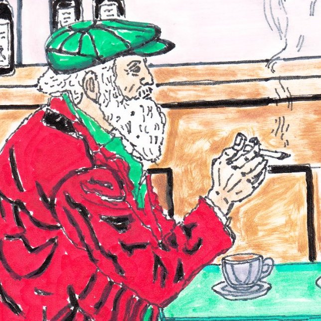 This mixed media artwork captures a quiet, introspective moment of a man sitting alone in a café, enjoying his coffee and a cigarette. The warm interior, rustic textures, and detailed surroundings create a nostalgic and cinematic atmosphere.