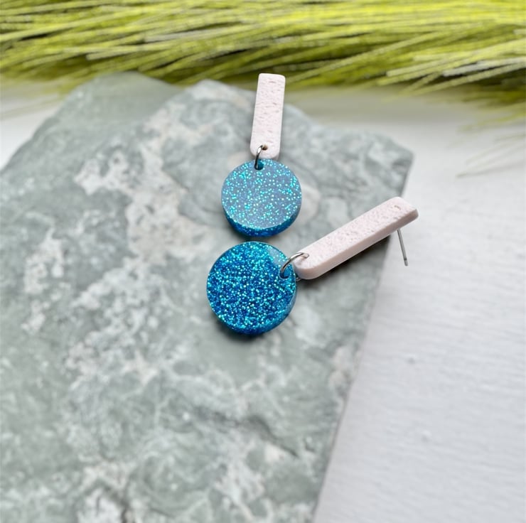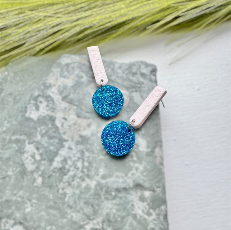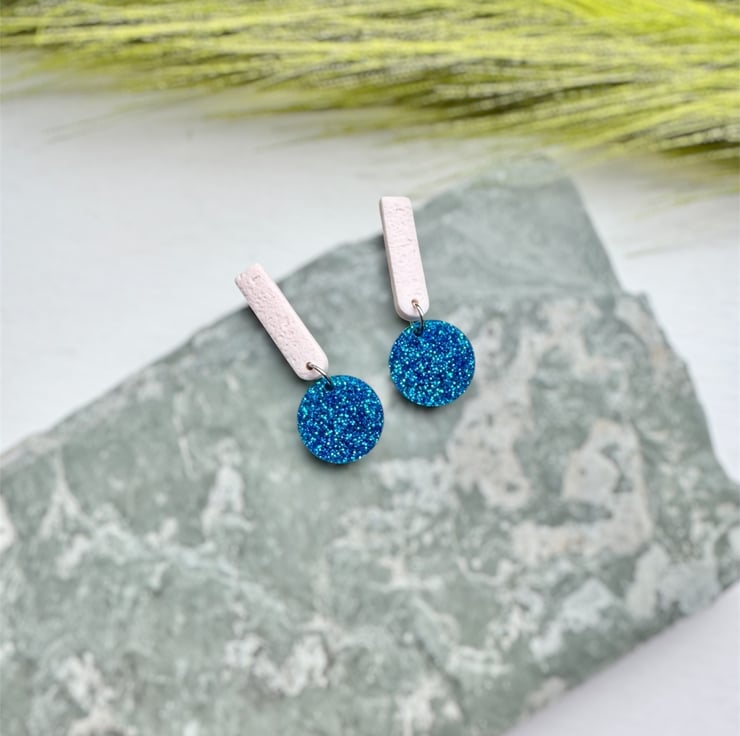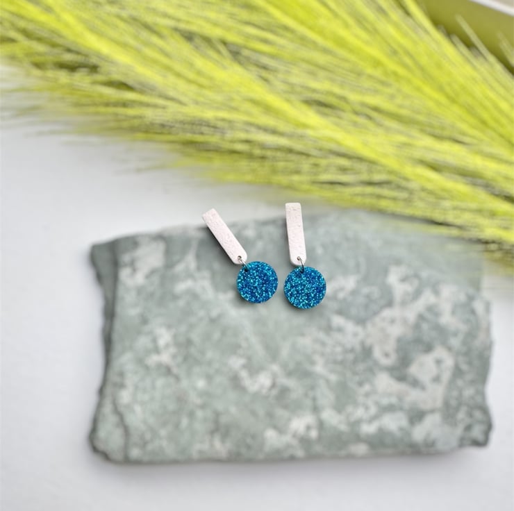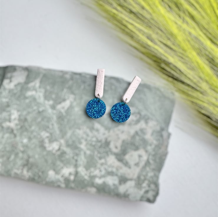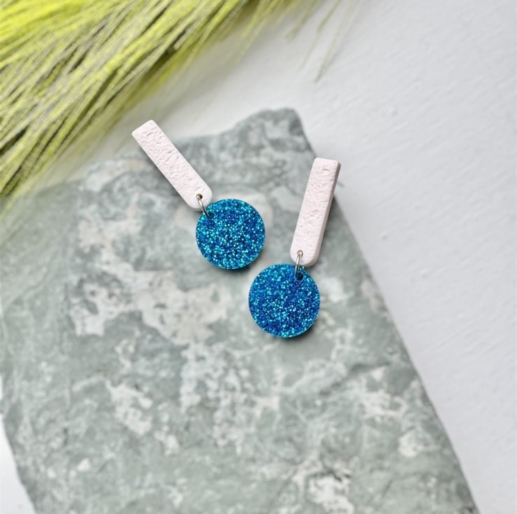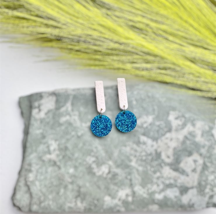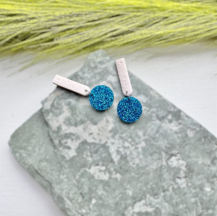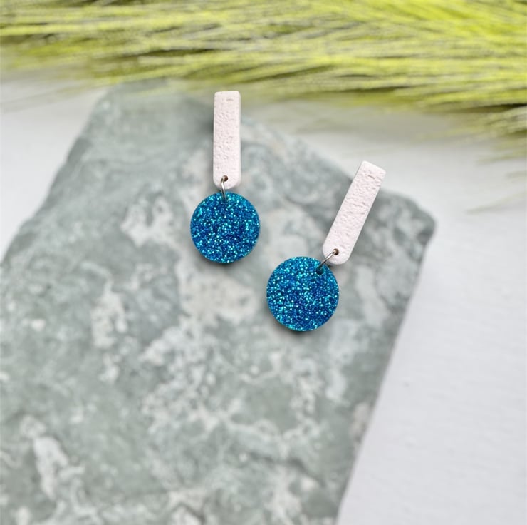 White Slimline textured Rectangles of Polymer Clay, with a Bright Glittering Blue Circle of Acrylic.