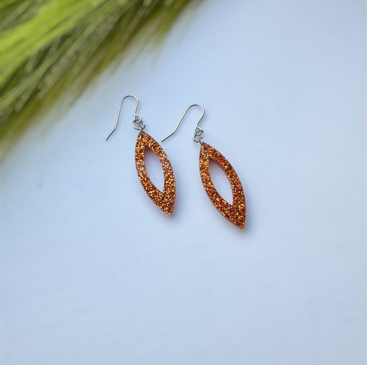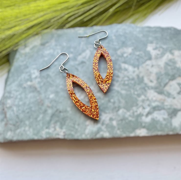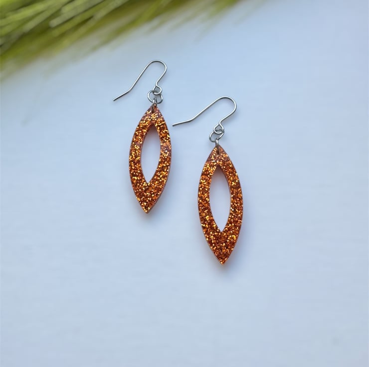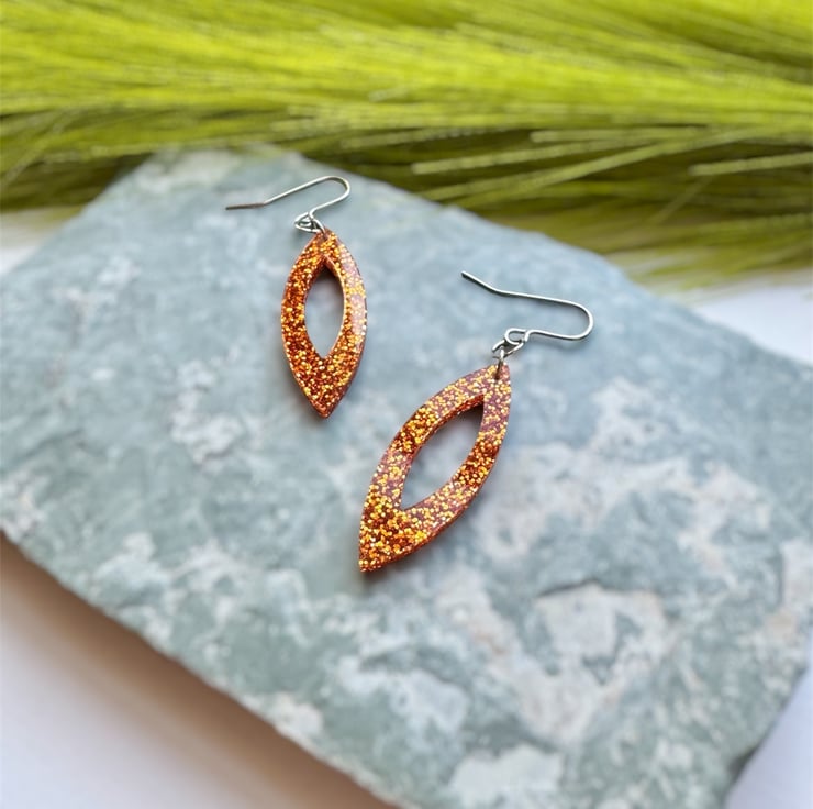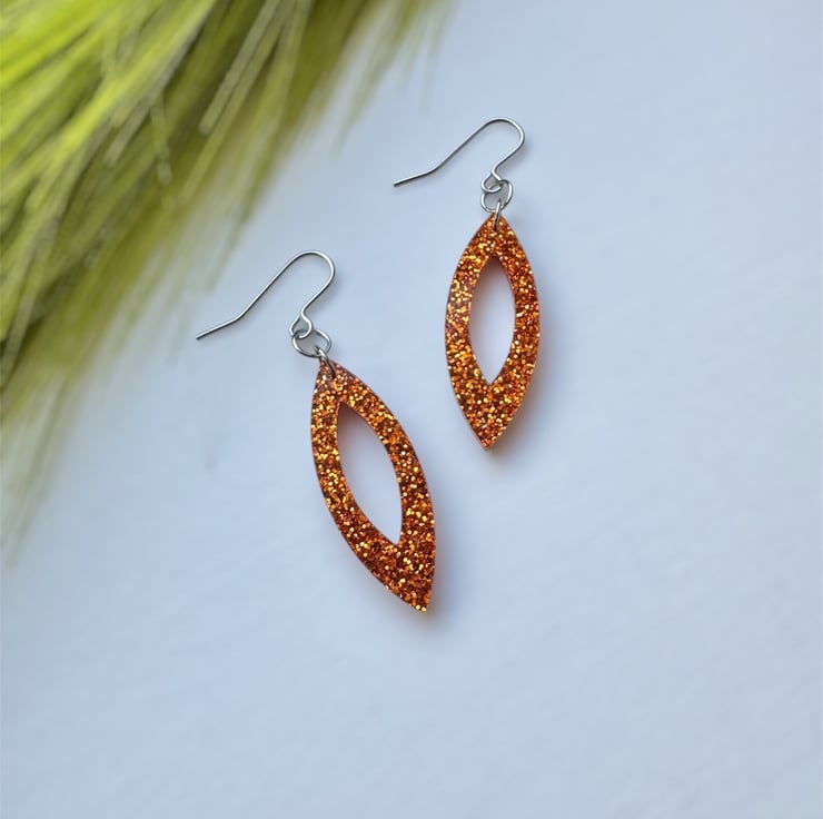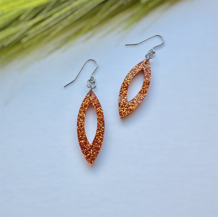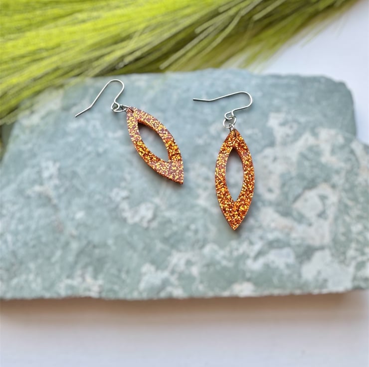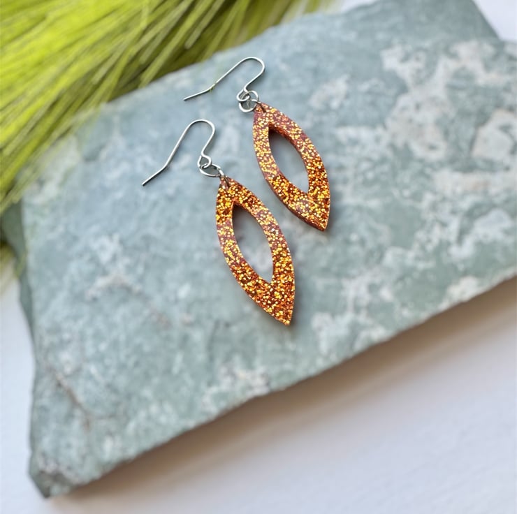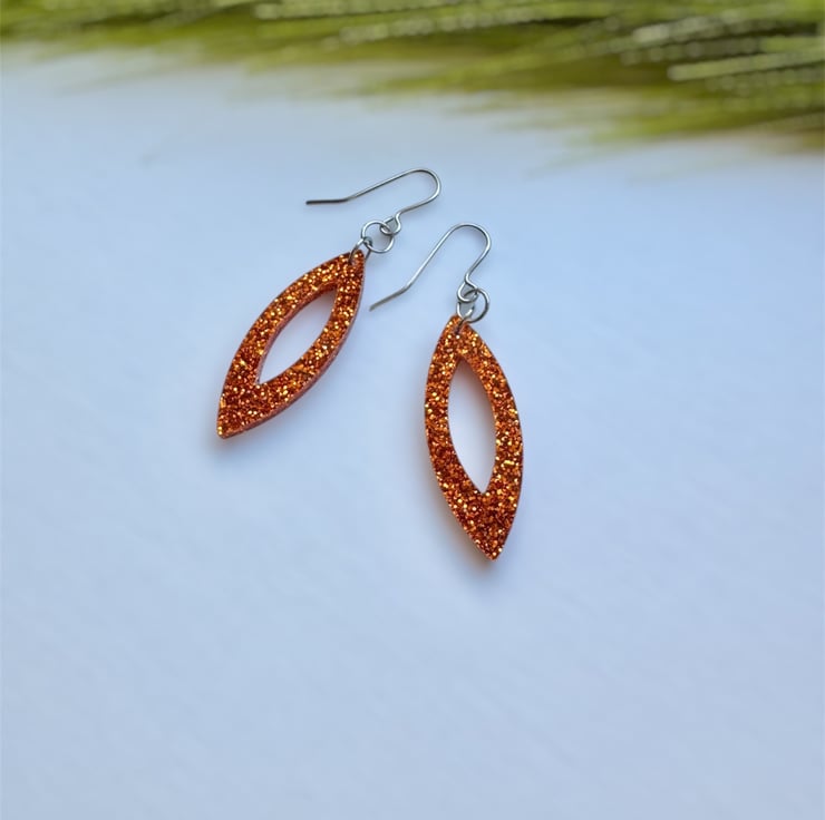 A stunning Navette like shape in Orange Glitter Acrylic.