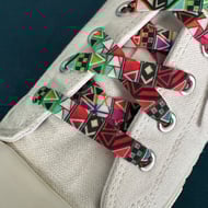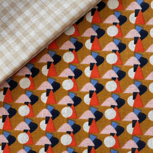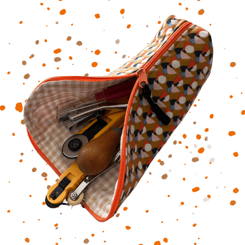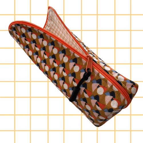 Sewn by hand using a geometric printed cotton and lined with co-ordinating beige checked fabric, it has a funky, retro feel. The zip opens wide, and then folds down so that everything inside is within reach, then closes snugly when it is time to tidy up. It is softly structured so that it keeps its shape without feeling stiff.