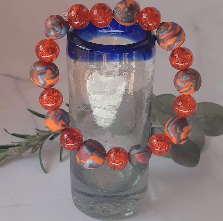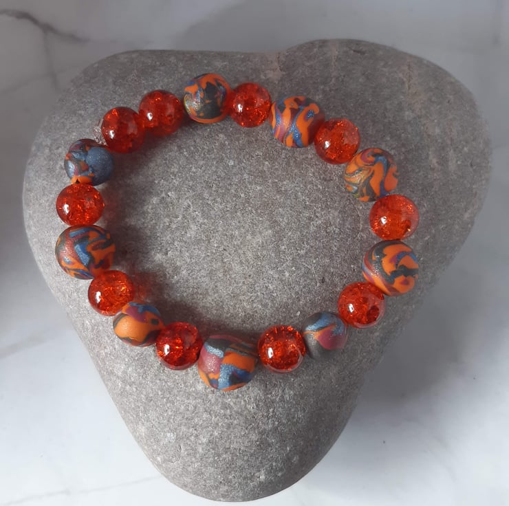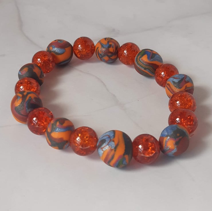 The polymer clay beads measure between 12.8mm and 10mm and are paired with 10mm orange crackle beads to create a colourful bracelet for everyday wear to as a gift to a friend