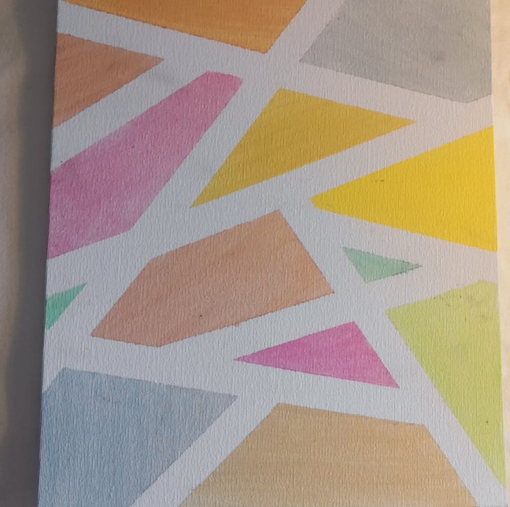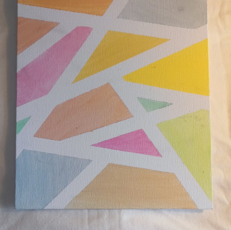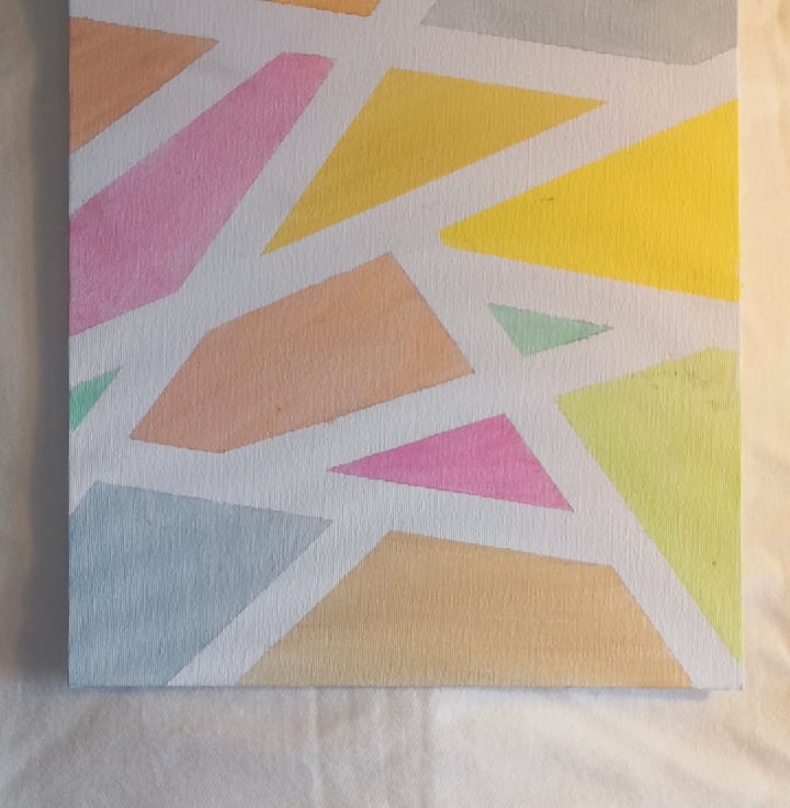 A gental , modren abstract painting in soothing pastel tone, this peace brings together soft yellow, peaches, blues,greens and pinks in the mosaic irregular geometric shapes. Each section is outlined with crisp white lines, creating a clean, contemporary look th feels more playfull and calming.