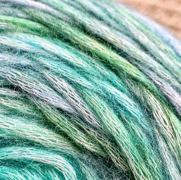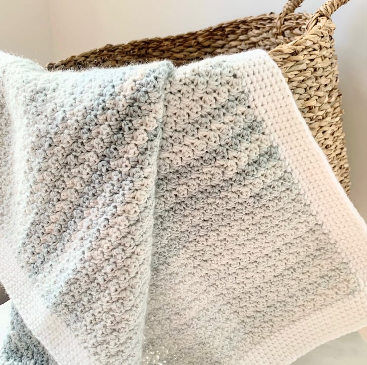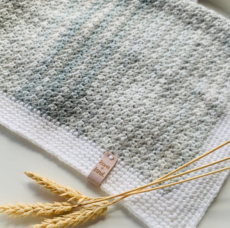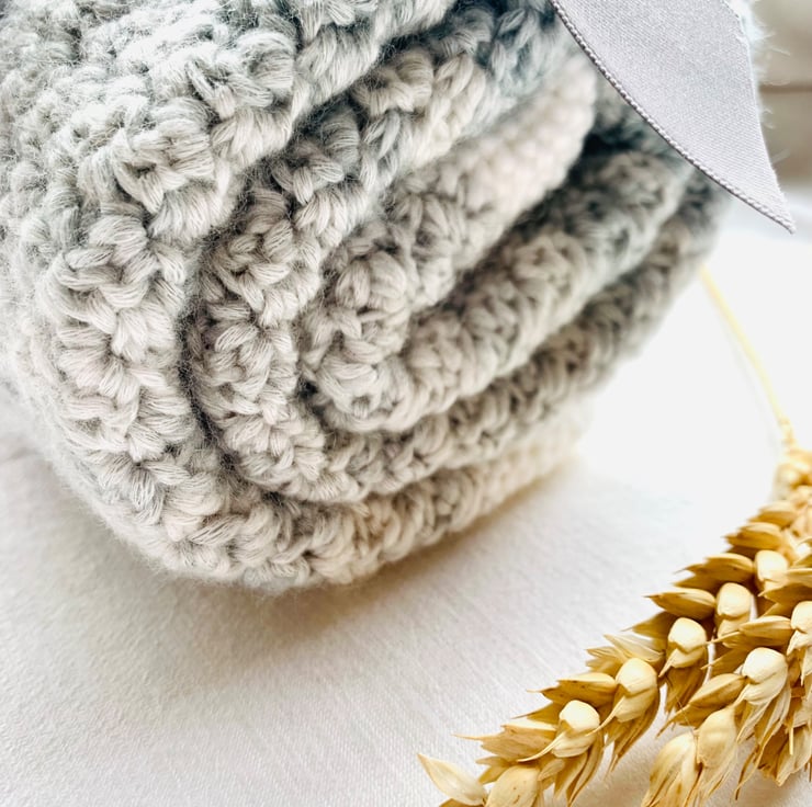Handmade by me using Yarnsmiths Pebble Haze Prints DK weight yarn, it is a blend of 67% Cotton and 33% Acrylic. The colour way is Charmouth. It is a soft ombré of grey and white tones with a solid white border to finish. This yarn is "blown yarn", which is a tube with the yarn fibres blown into it, creating a fibre with a soft halo effect.