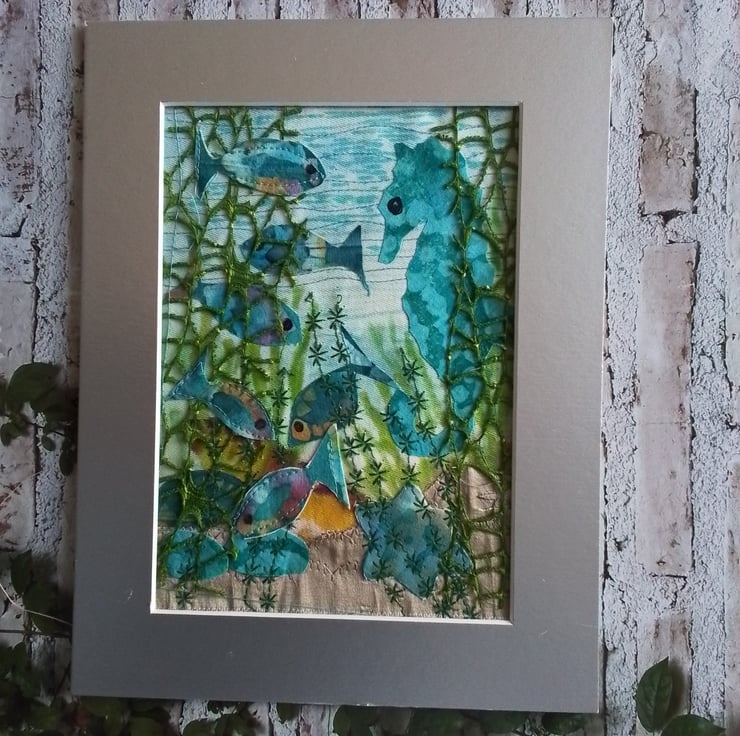 Fabric sealife picture , created with a hand painted background, onto which sea horse and fish were attached with bondaweb and machine stitching. The fabric mesh was then hand stitched into place.