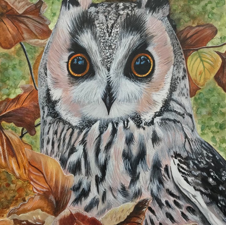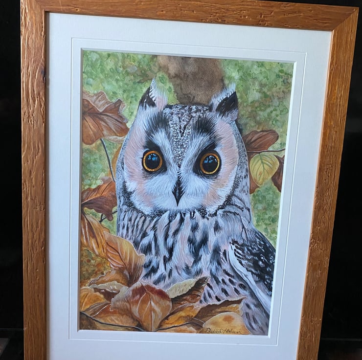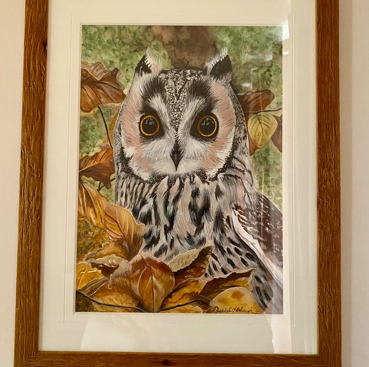 A beautiful piece of original art of our British native Long Eared Owl. Painted using Winsor & Newton Watercolours on Winsor & Newton Cold Pressed Watercolour paper this piece would make a perfect gift for any Owl lover. Comes professionally mounted and framed in a beautiful quality wooden frame. Own your own piece of original art. Size, including frame is 17.5 x 22.5 inches.