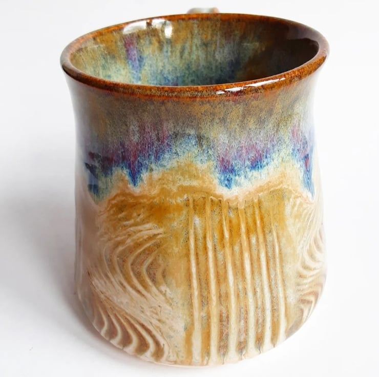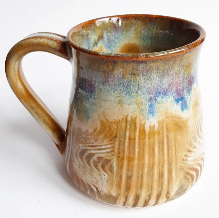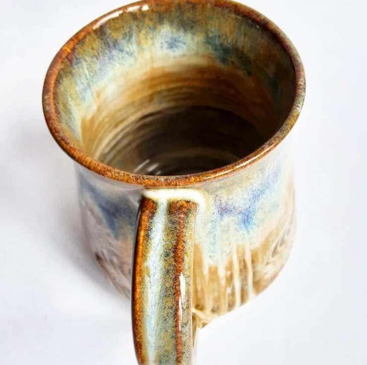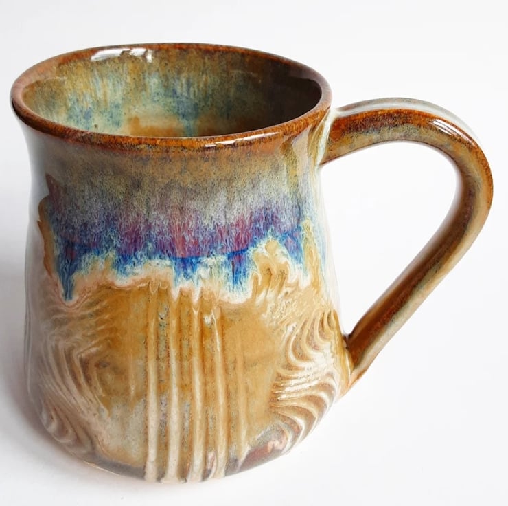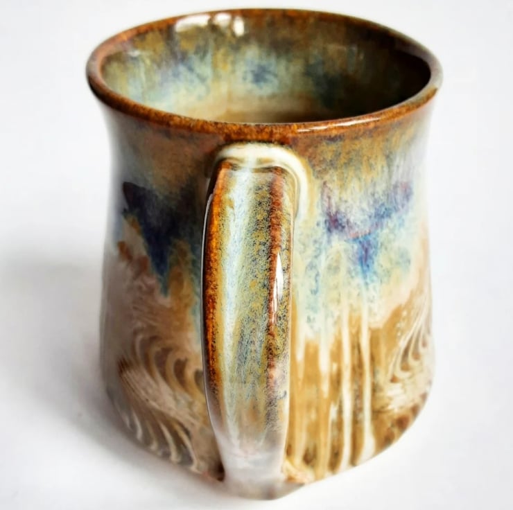 Glazed in brown blue glazes with a pattern on the mug.