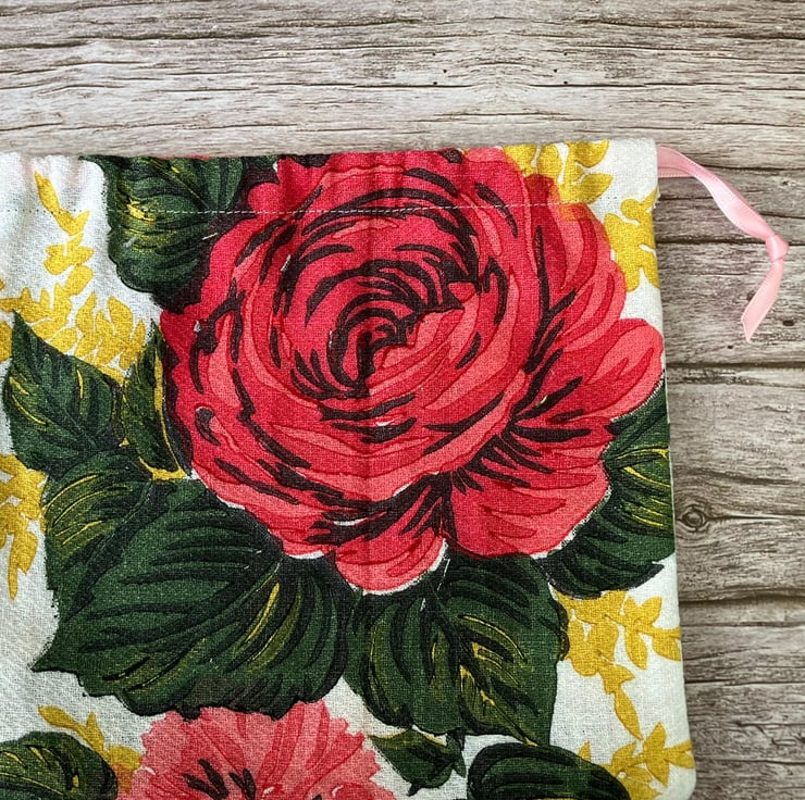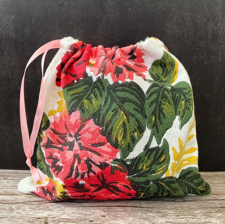 1950s Floral 'Carnations & Roses' Vintage Barkcloth Drawstring Bag, Pink Ribbon