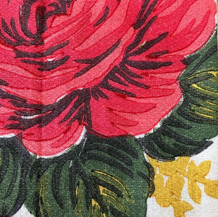 This 1950s vintage cotton barkcloth fabric is in fabulous condition. The design features carnations, roses and contrasting springs of goldenrod