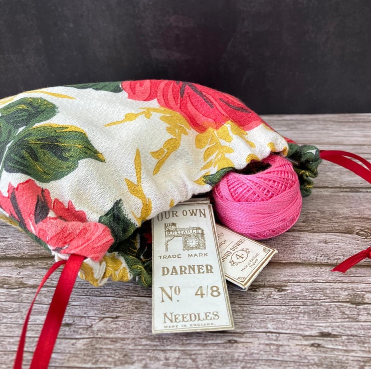 Drawstring bags are useful for so many things and this one is really pretty too. You can use them for keeping things together like craft materials, make up and those little things you want to keep together in your bag. You could hang them up to brighten up a room and they also make great reusuable gift bags.