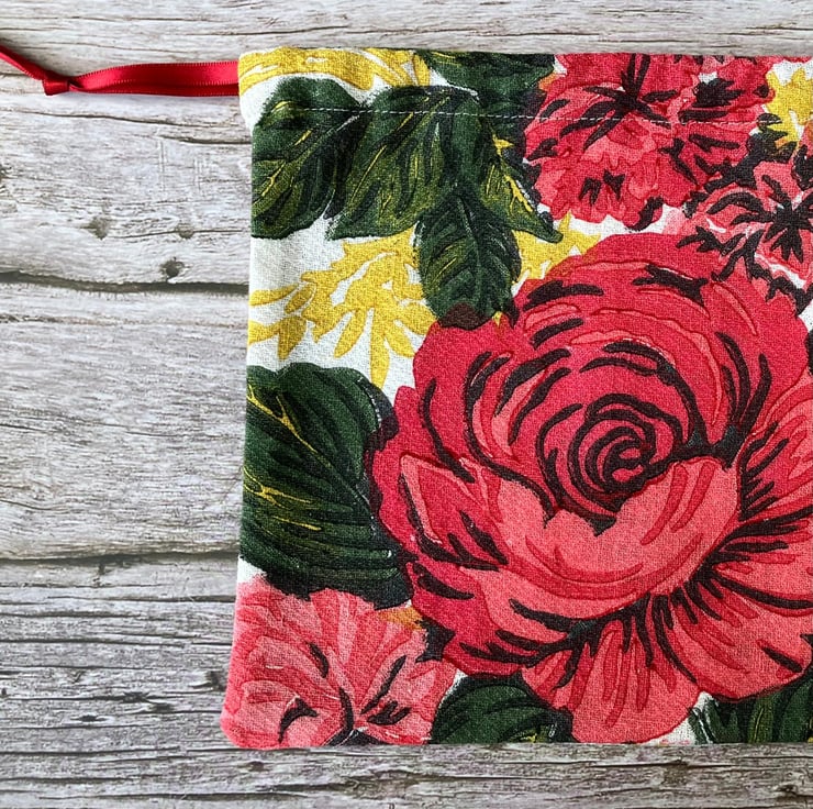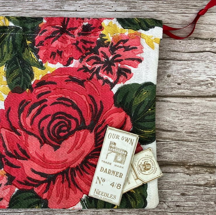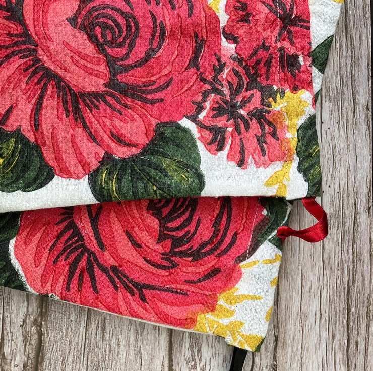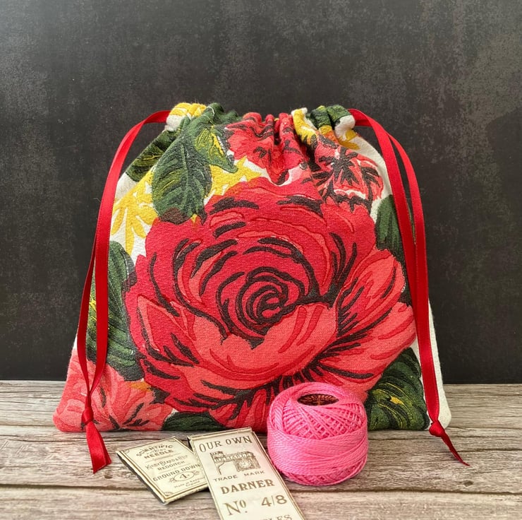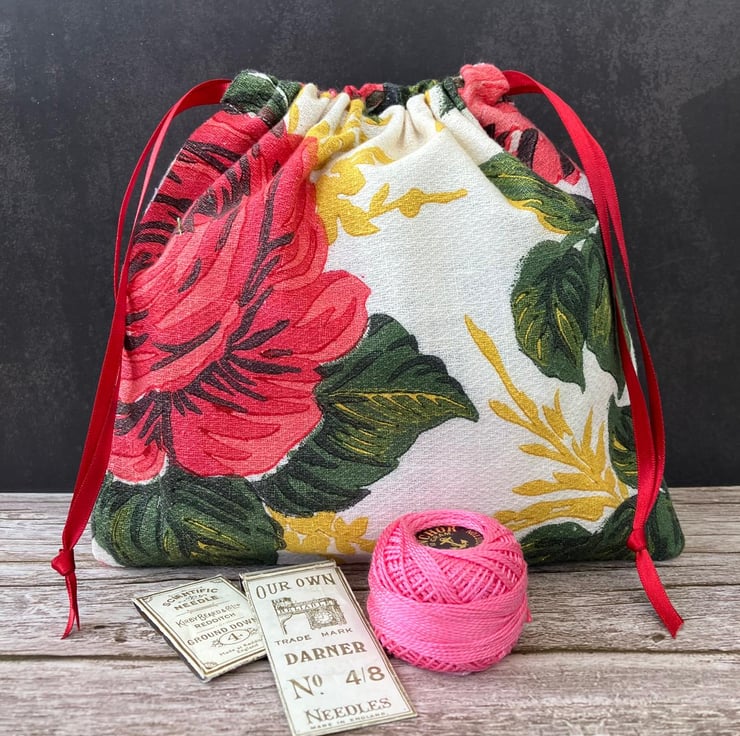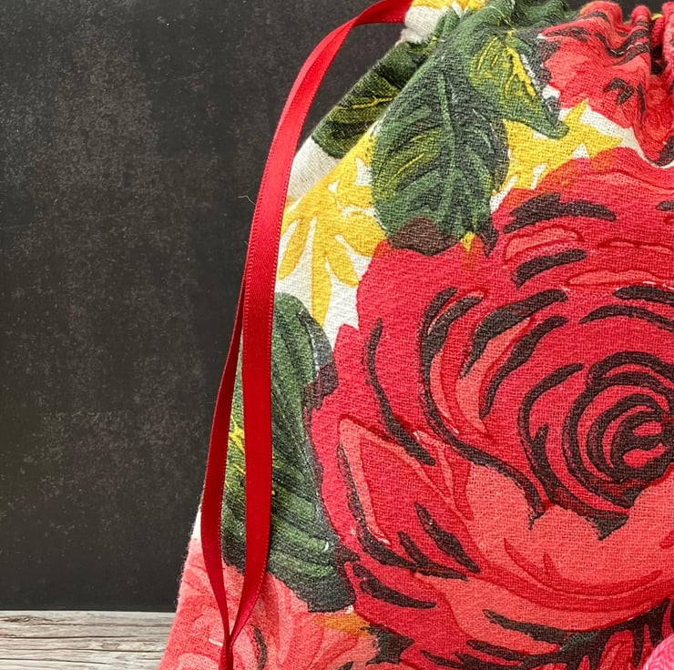 1950s Floral 'Carnations & Roses' Vintage Barkcloth Drawstring Bag, Wine Ribbon