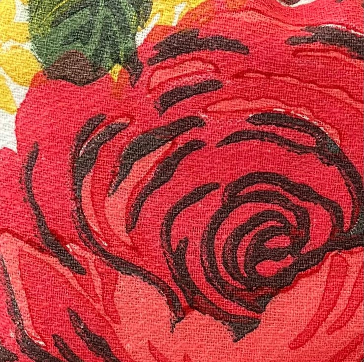 This 1950s vintage cotton barkcloth fabric is in fabulous condition. The design features carnations, roses and contrasting springs of goldenrod
