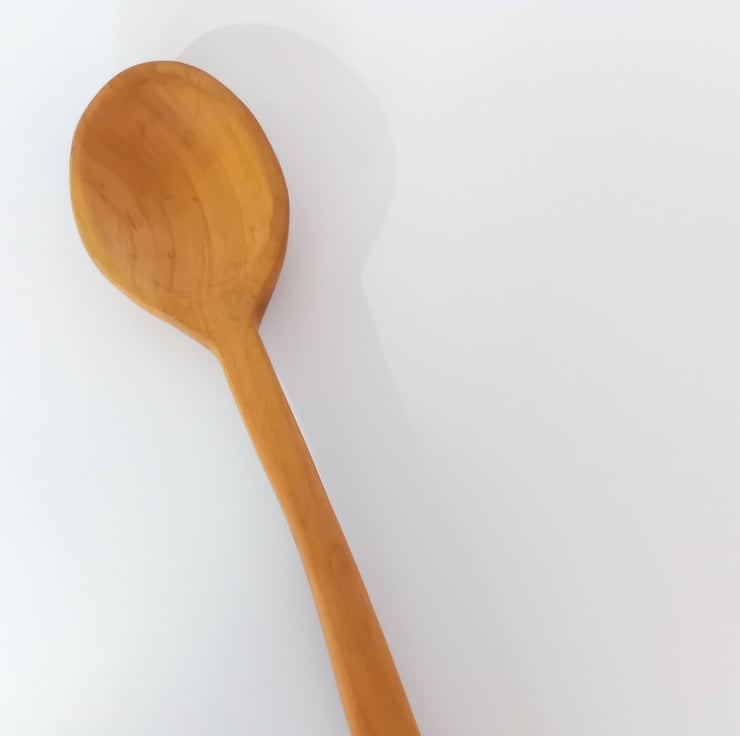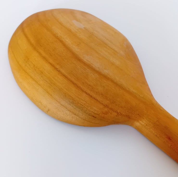 A unique large spoon of Cherry wood hand carved with traditional drawknife and spokeshave. It has been sustainably sourced from coppiced woodland and finished with food safe tung oil. 39cm long approx.