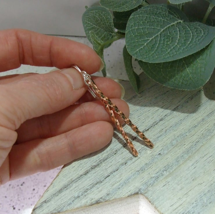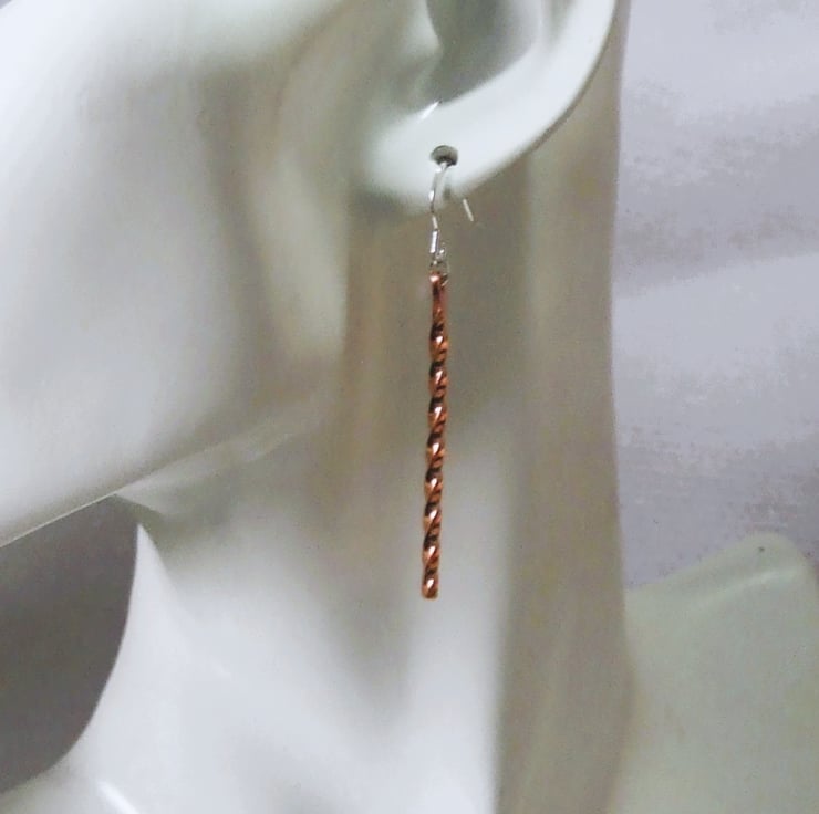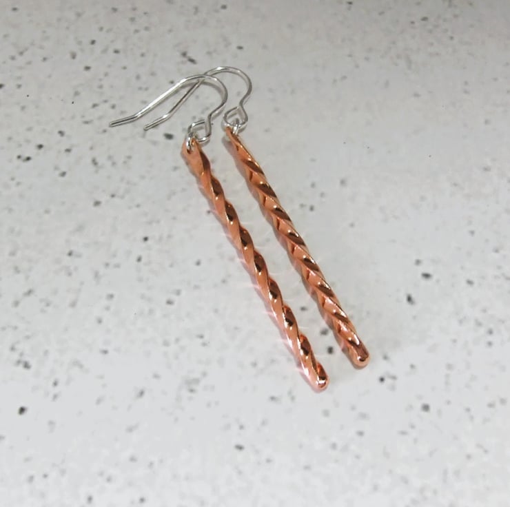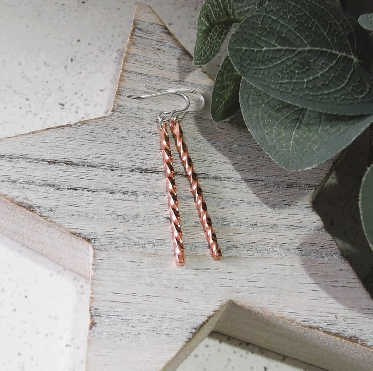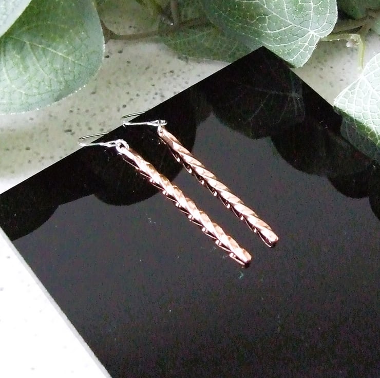 The droppers have been created by hand with 2mm square copper wire twisted to create pretty reflective bars. Fitted to .925 sterling silver ear hooks.