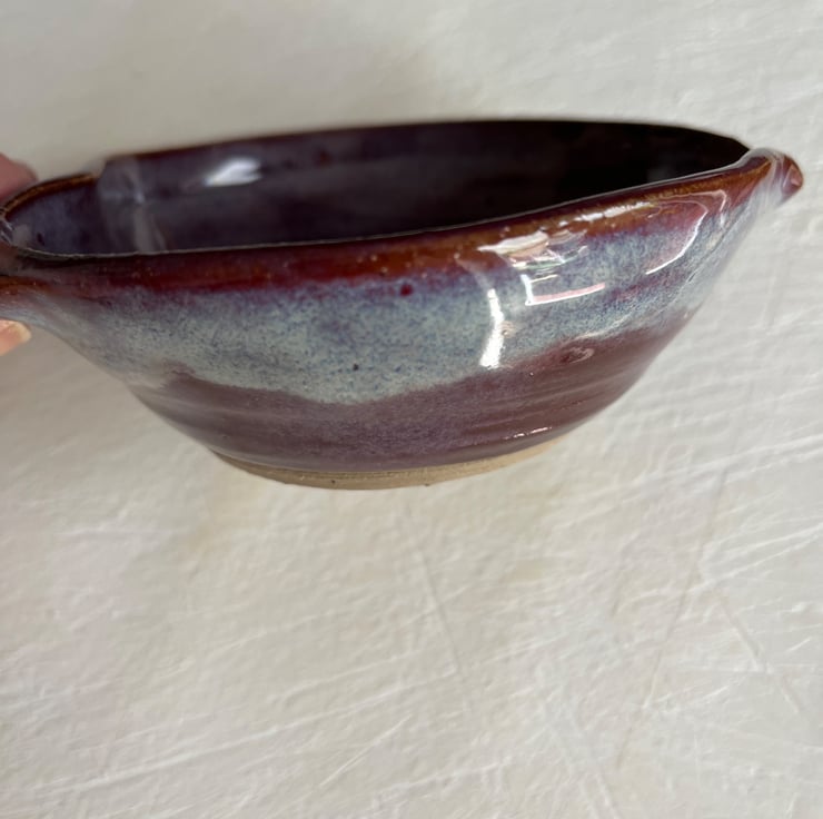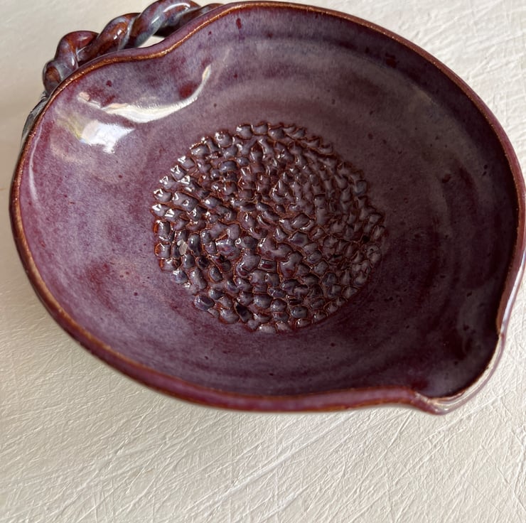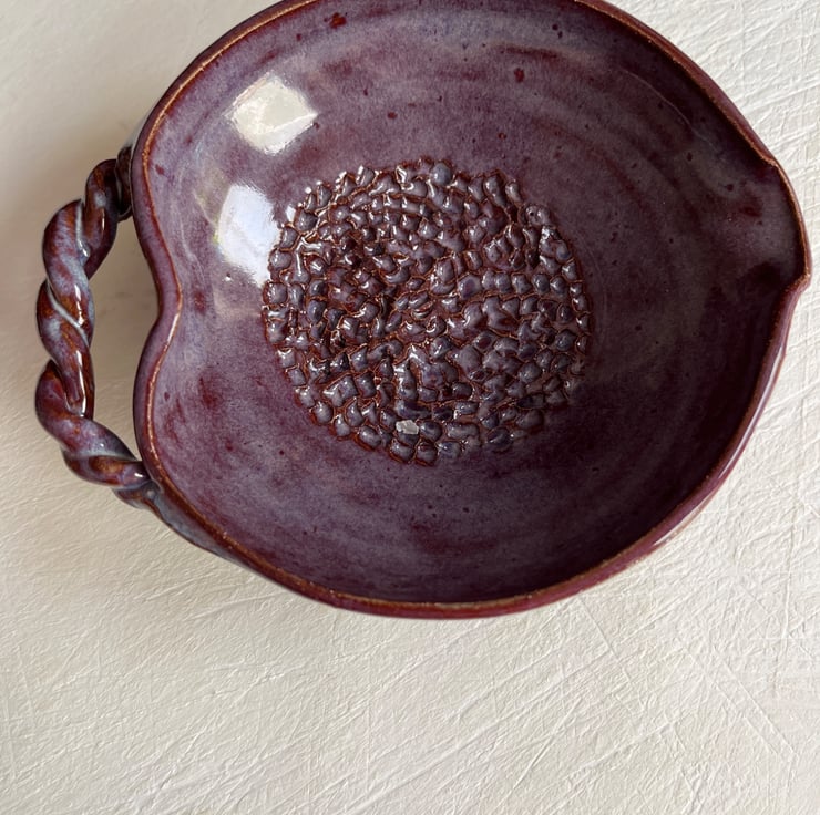 Beautiful deep garlic grater bowl . Heart shaped with pouring spout and twisted handle