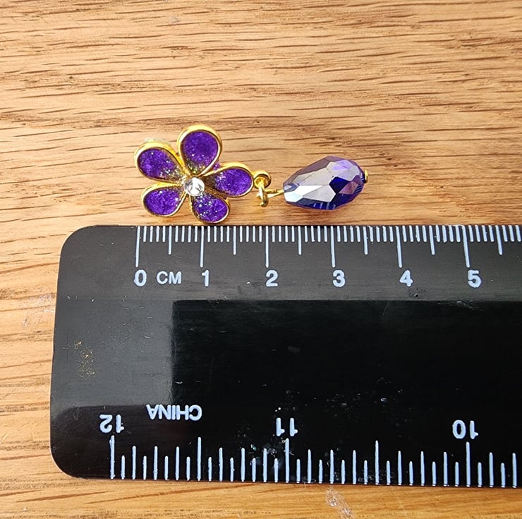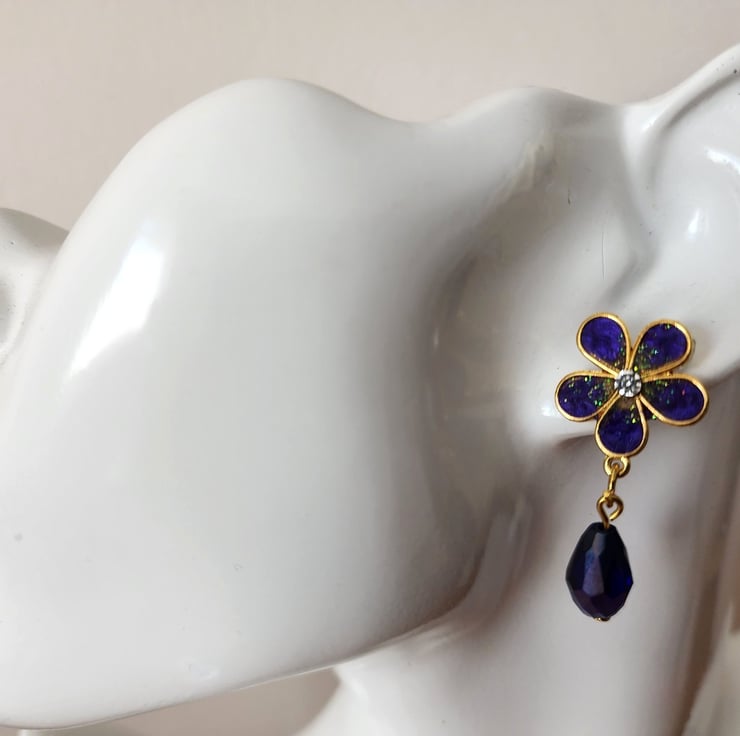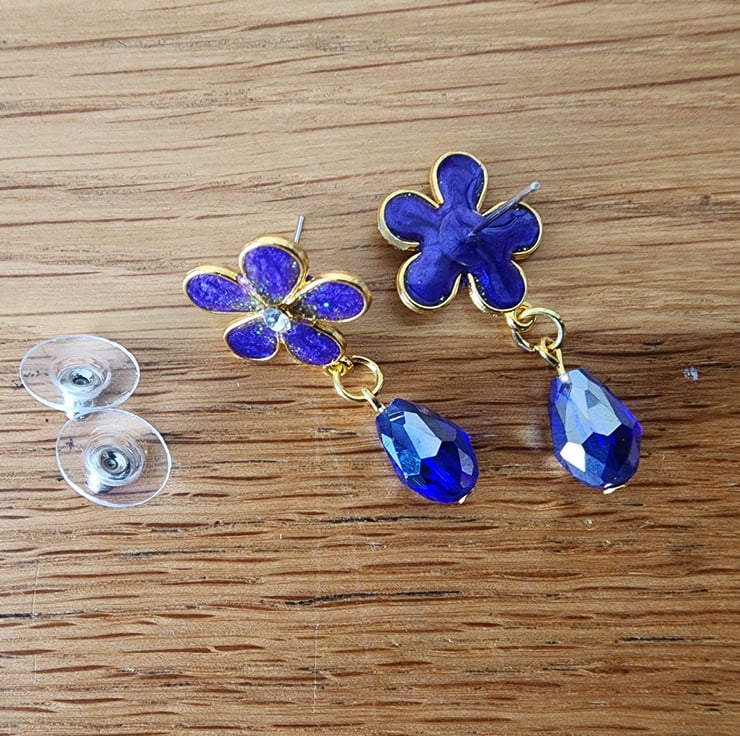 These pretty earrings have been made using iridescent powder and glitter inserted into resin. The backs are surgical steel and have been glued and coated with resin to create a secure hold. The little crystal drop bead adds a bit more sparkle to the movement.