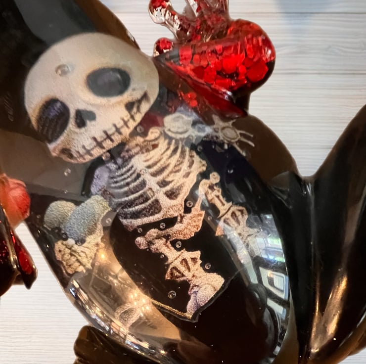 Carefully crafted by hand, this unique piece blends quirky and alternative styles, making it perfect for lovers of gothic decor, Halloween aesthetics, or unusual collectibles. The glossy black finish contrasts beautifully with the embedded skeleton artwork, while the red glitter hands give it a bold, eye-catching edge.