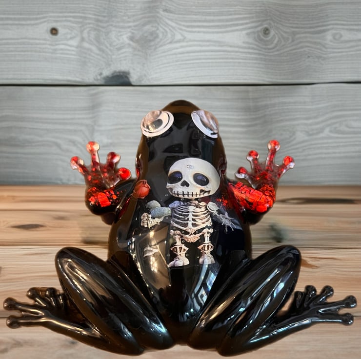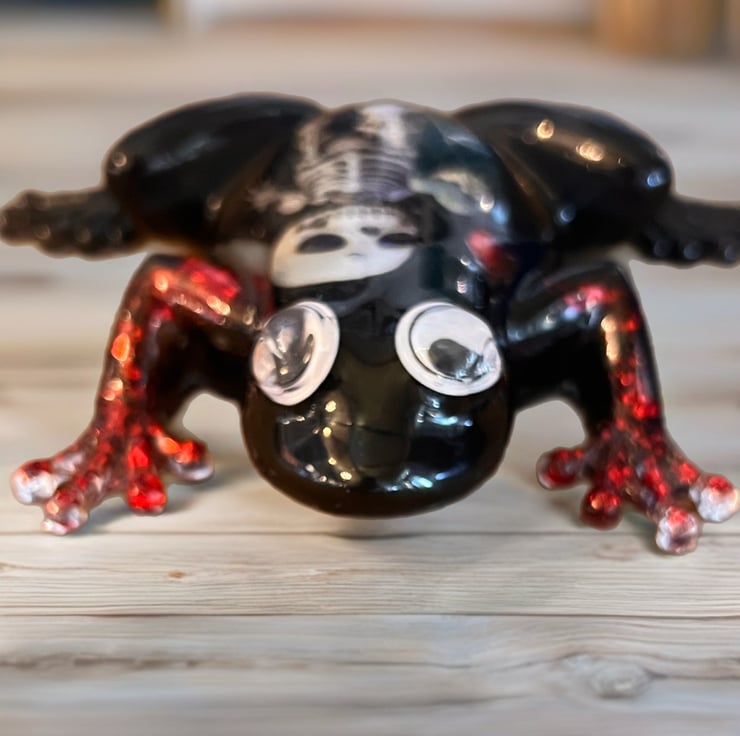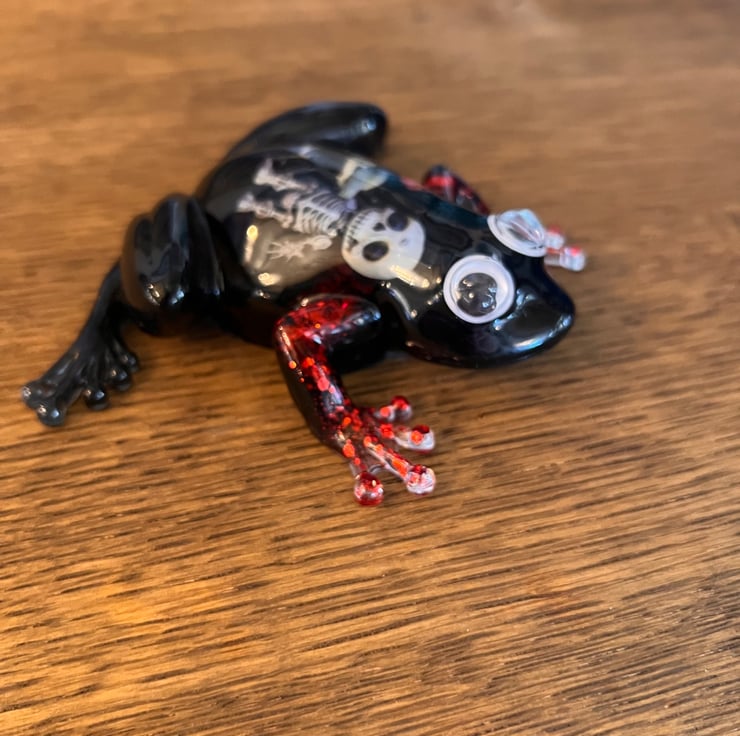 Add a touch of dark charm to your space with this handmade gothic resin frog, featuring a striking skeleton design and shimmering red glitter accents.