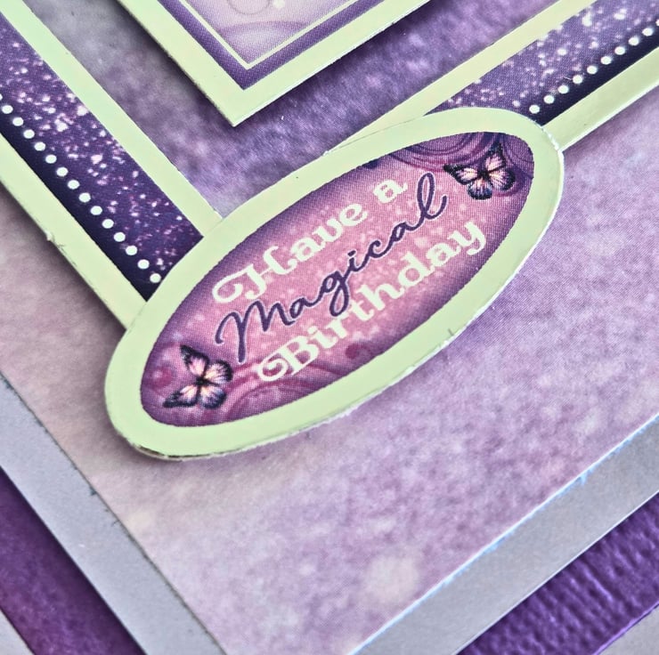 Made of a white card base, it is double layered with lilac mirror card, light purple cardstock and quality patterned card in matching lilac shades. The main image is surrounded by a coordinating frame that sits on a panel of a patterned card. It features five butterflies in different sizes, on a dreamy background. The sentiments "To Someone Fabulous" & "Have A Magical Birthday" are laying on two opposite corners, with decorative strips embellishing the other two. Finished with decorative, self-adhesive gemstones in soft lilac. Inside, the luxury, pearlized insert accommodates the sentiment "With Love & Best Wishes" on the right, with a floral design on the left, still leaving you with plenty of room available for your handwritten messages and wishes.