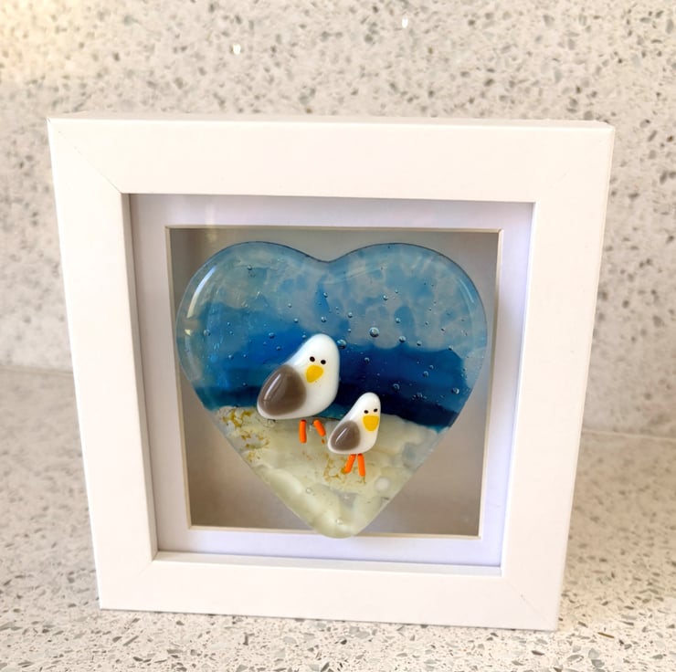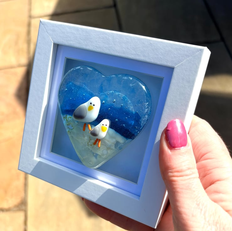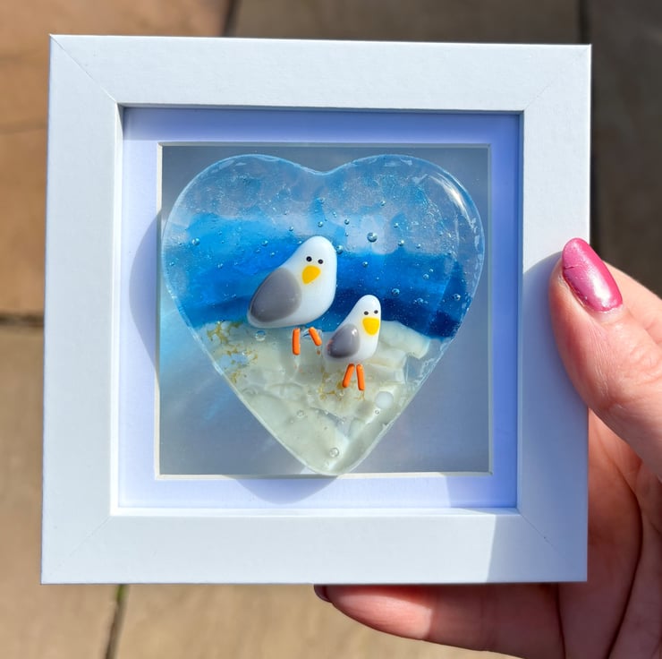 Super cute seagull picture created over 3 firings and comes ready to hang . Sea themed with blue skies and beach . Only one available . Each frame is approximately 10 cm square and can be wall hung or stood up .