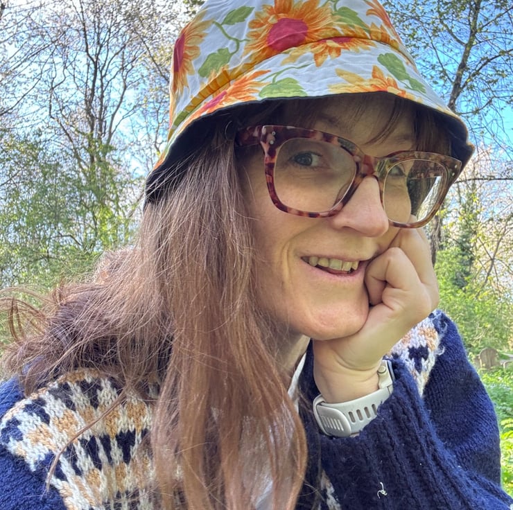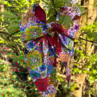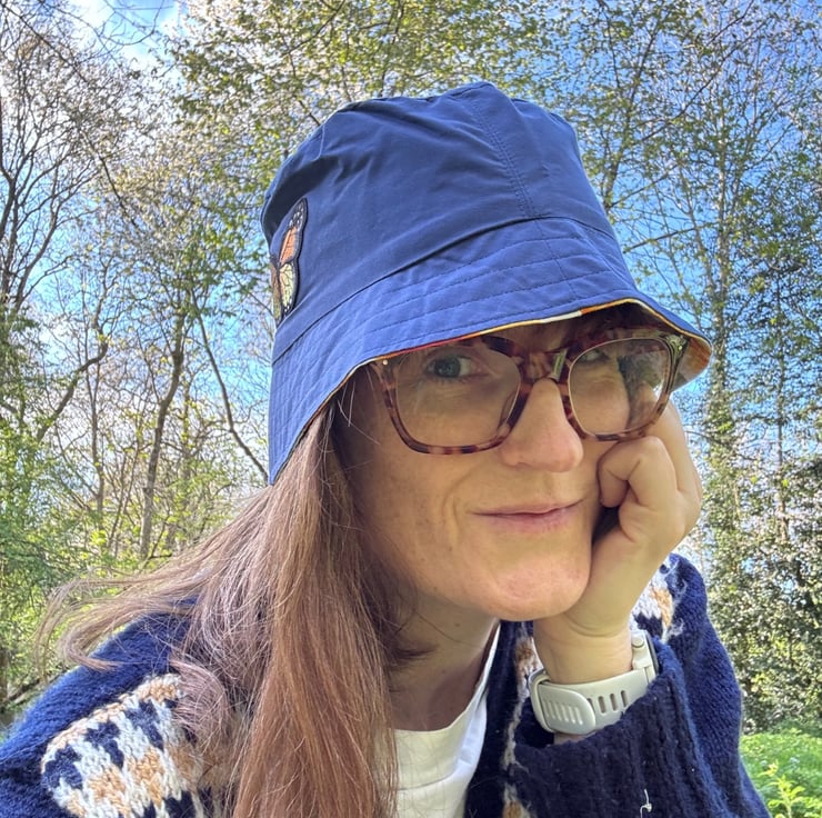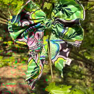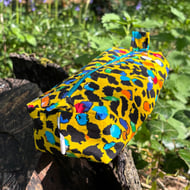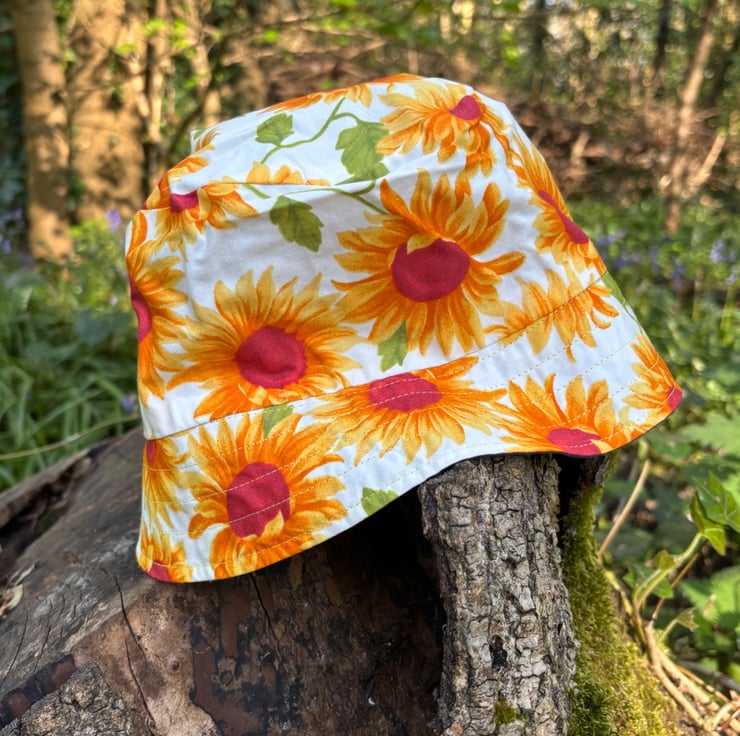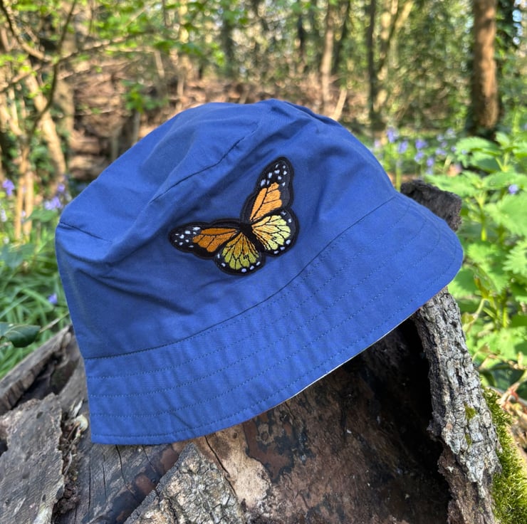 Home crafted bucket hat in navy cotton with butterfly motif. A bright sunflower lining makes this lightweight hat fully reversible. Designed and made by me, the crown circumference is 22"/55.9cm)