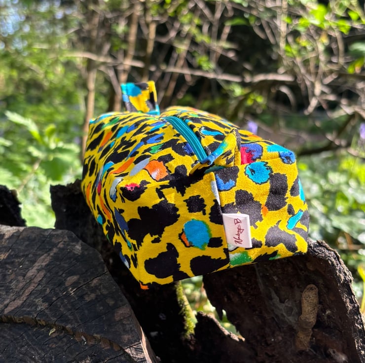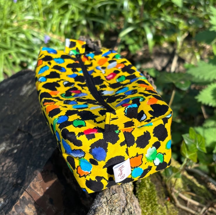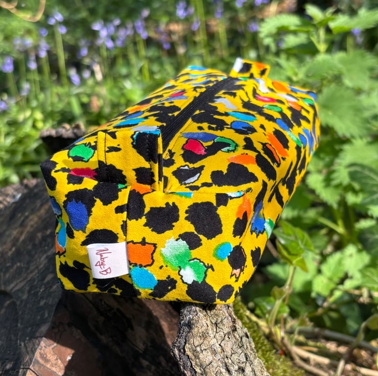 Hand crafted makeup or skincare bag in yellow-backed leopard print with multicoloured splodges.