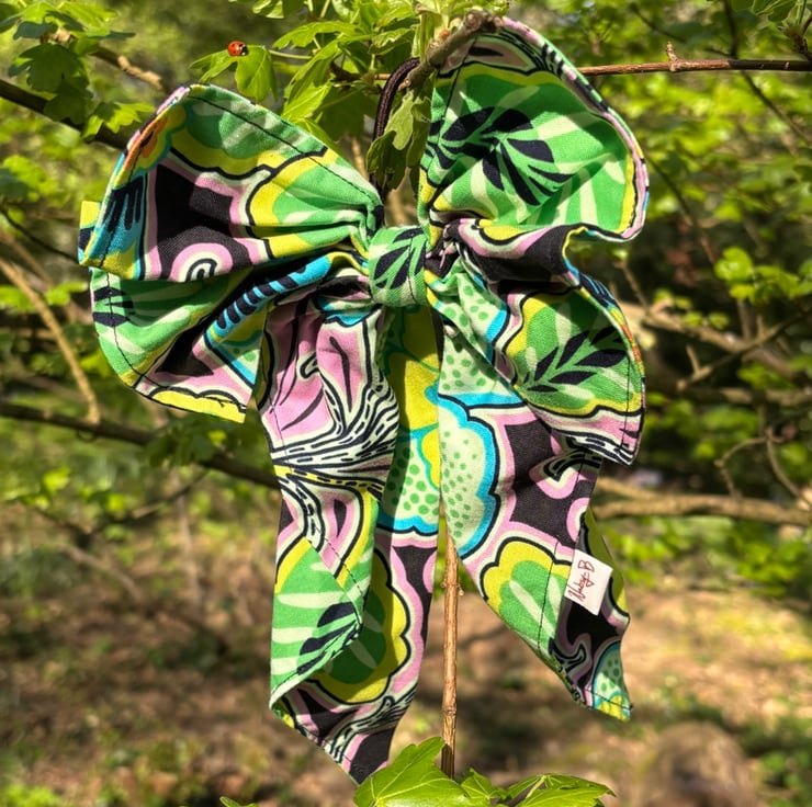 Super cute hair bow on a hair band made from remnants of brightly coloured, bold floral print.