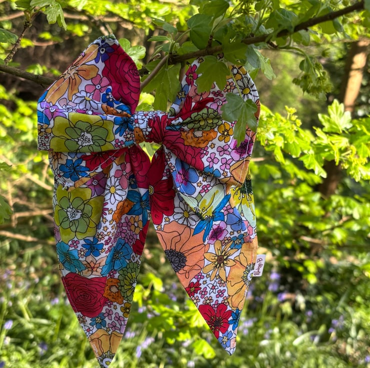 Super cute hair bow on a hair band made from remnants of bright floral print.