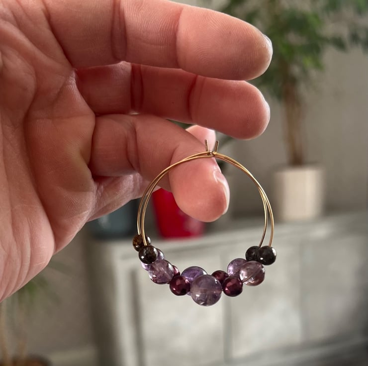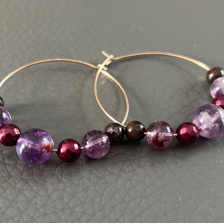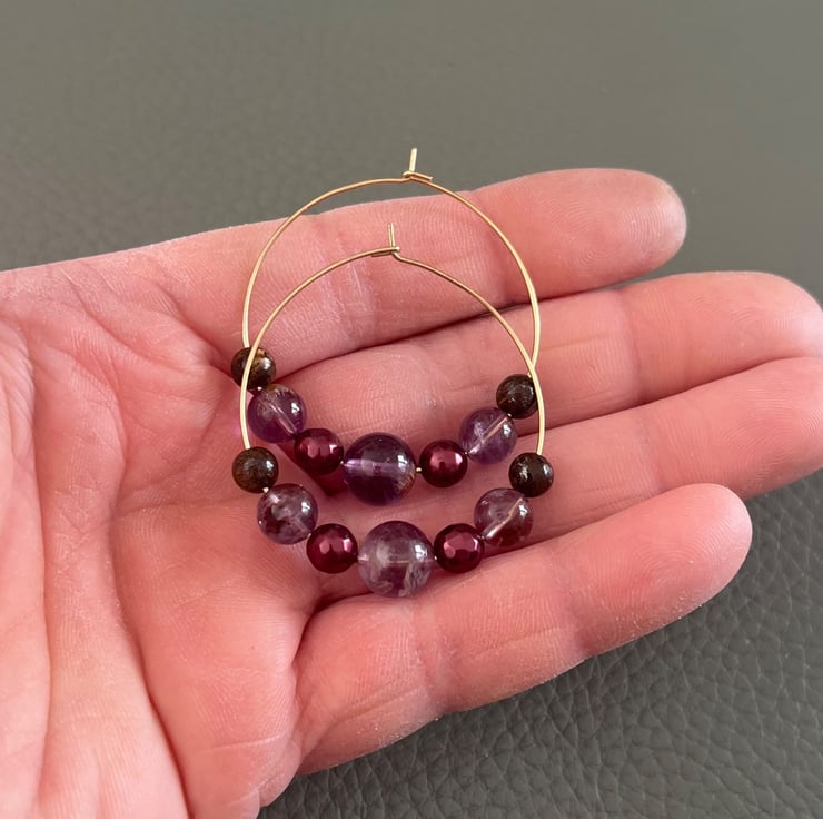 Delicate handmade hoop earrings adorned with natural gemstones in rich shades of purple and deep burgundy. Featuring amethyst, freshwater pearls and bronzite beads, each pair is carefully assembled by hand, making every piece one of a kind. Set on elegant gold-tone hoops, these earrings are lightweight, stylish, and perfect for both everyday wear and special occasions.