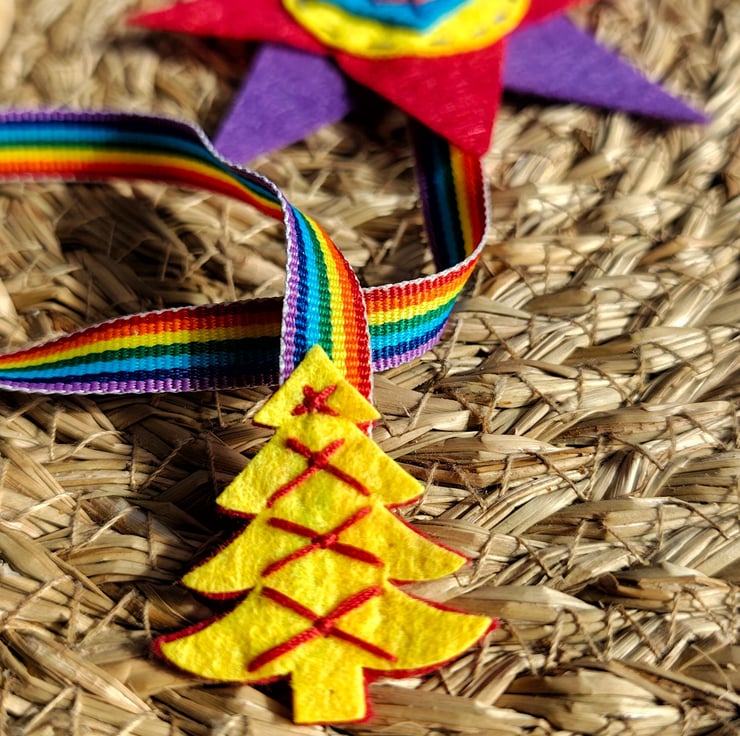 A decorative ribbon is attached to the top, ending with an embroidered Christmas tree measuring approximately 4 cm x 3 cm.